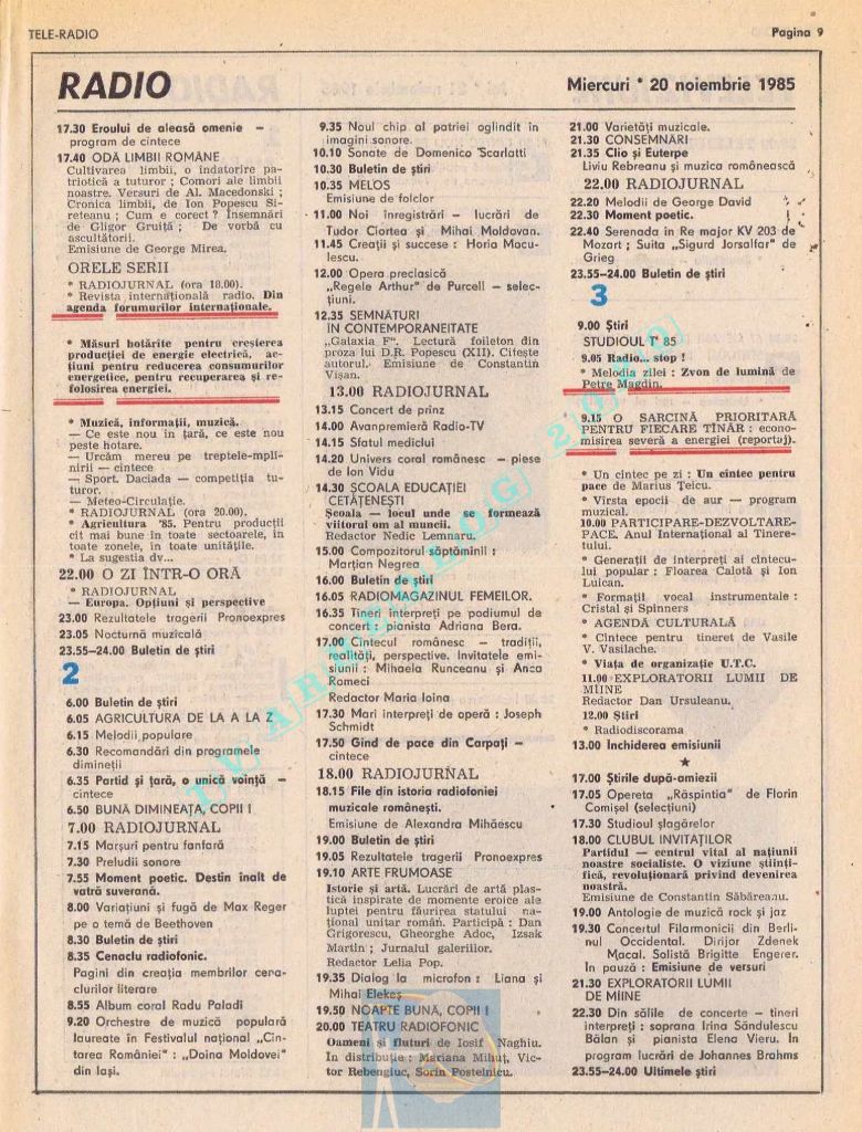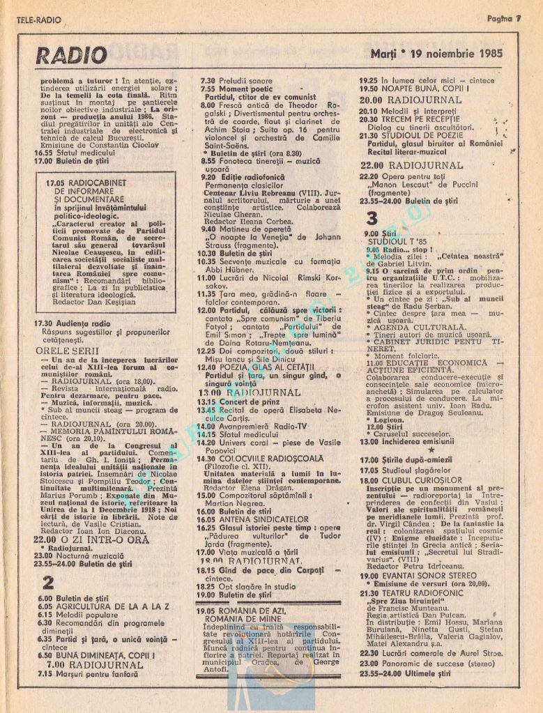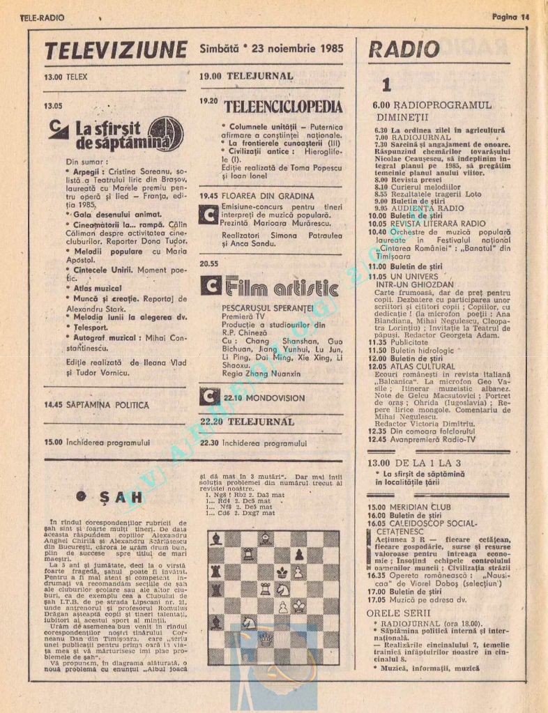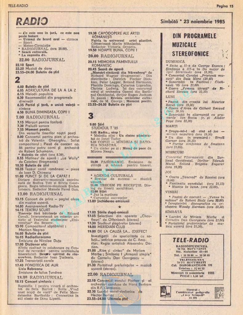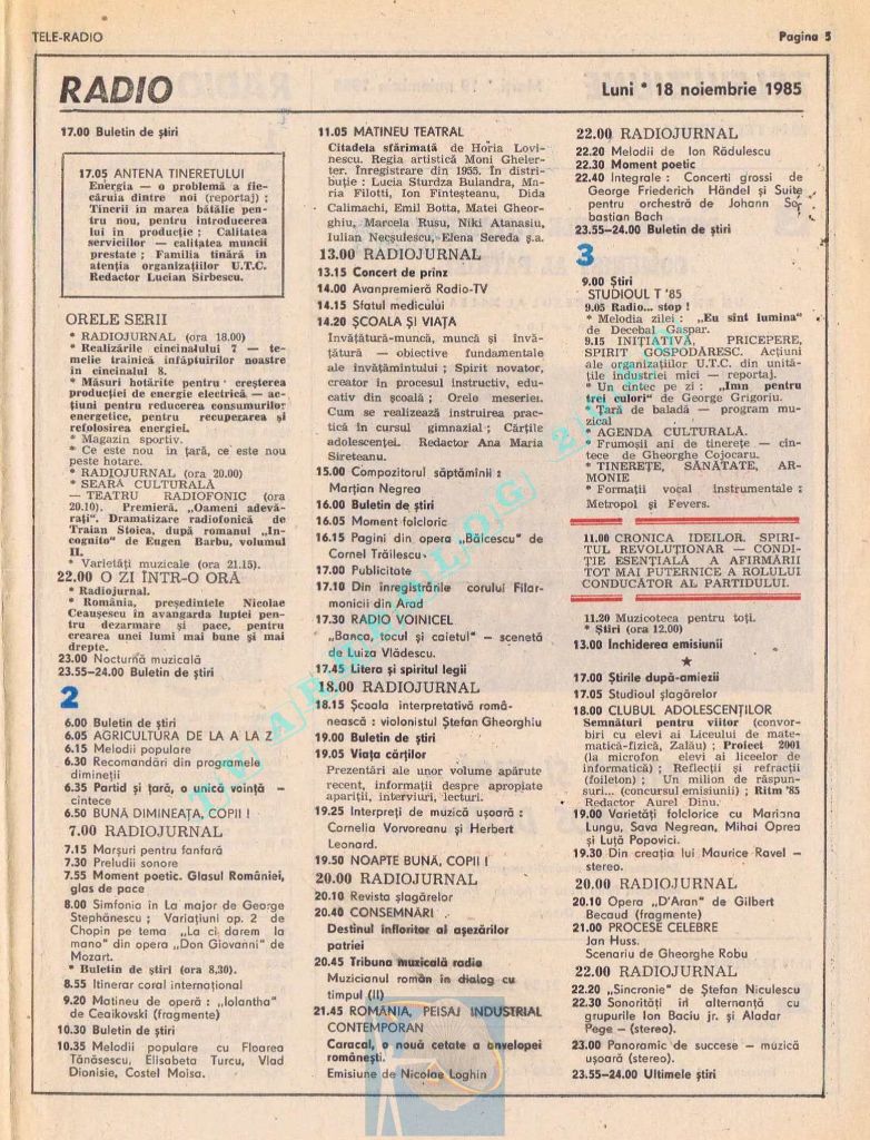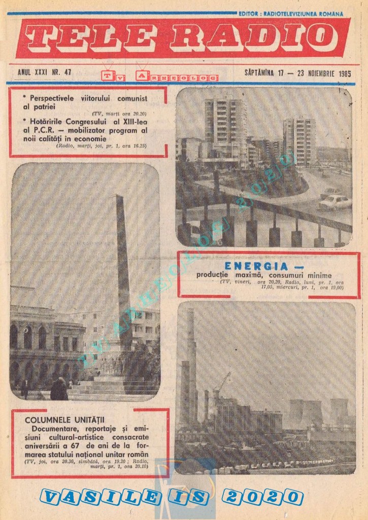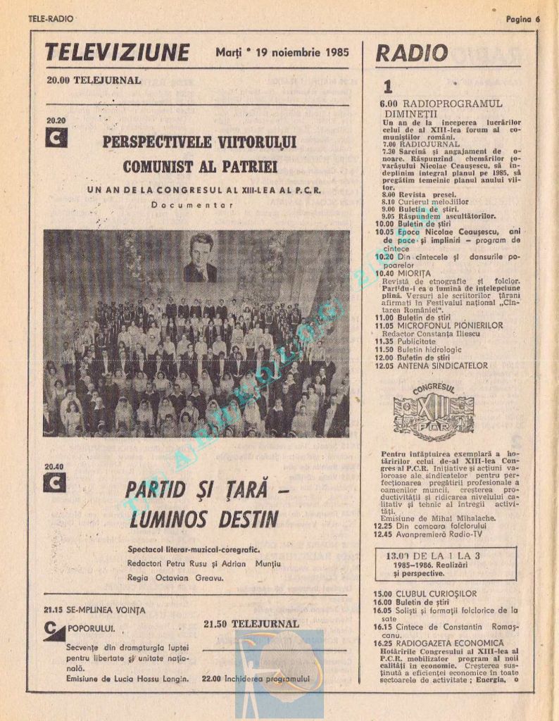 E singura dată când revista a apărut cu acest frontispiciu colorat în roșu. Poate că voiau să semnaleze momentele politice importante, așa cum revista „Săptămâna” avea o altă schemă de culori când comuniștii aveau ceva de sărbătorit. Acum, cred că au aniversat un an de la cel de-al XIII-lea congres al Partidului Comunist Român, care a început pe 19 noiembrie 1984. Posibil ca ulterior să fi abandonat ideea schimbării culorii frontispiciului, ea rămânând albastră până la ultima apariție din decembrie 1989.