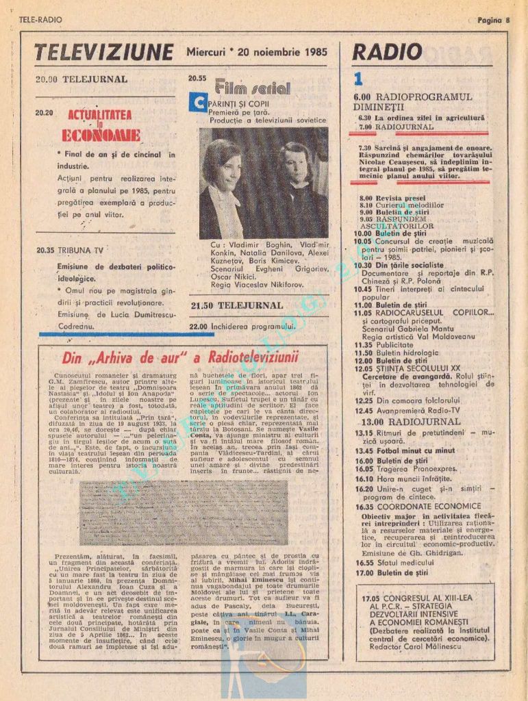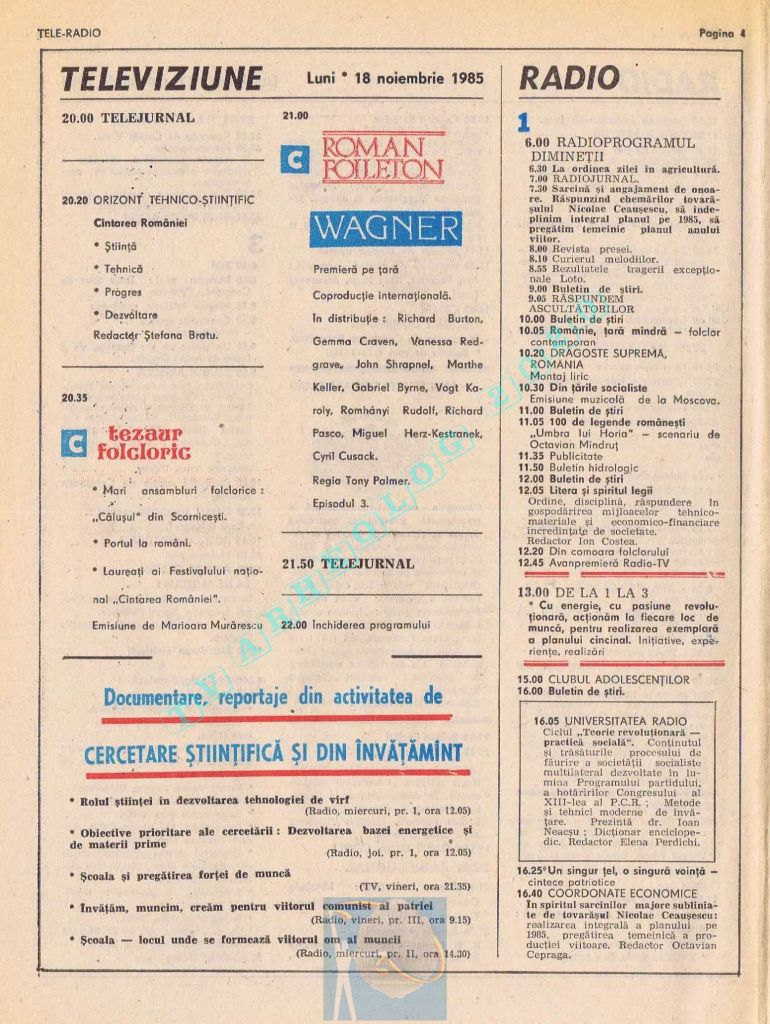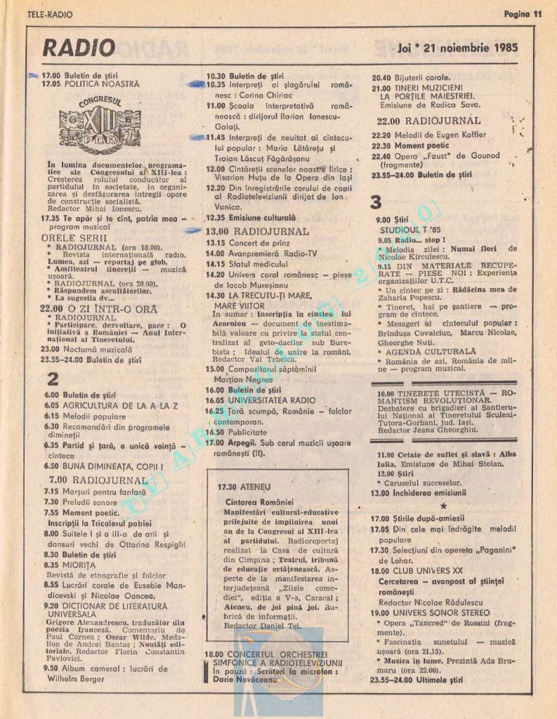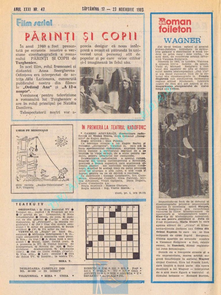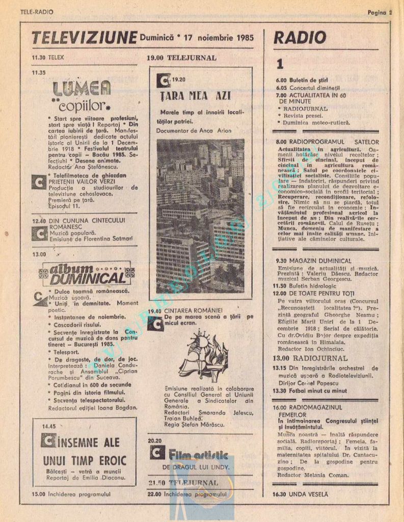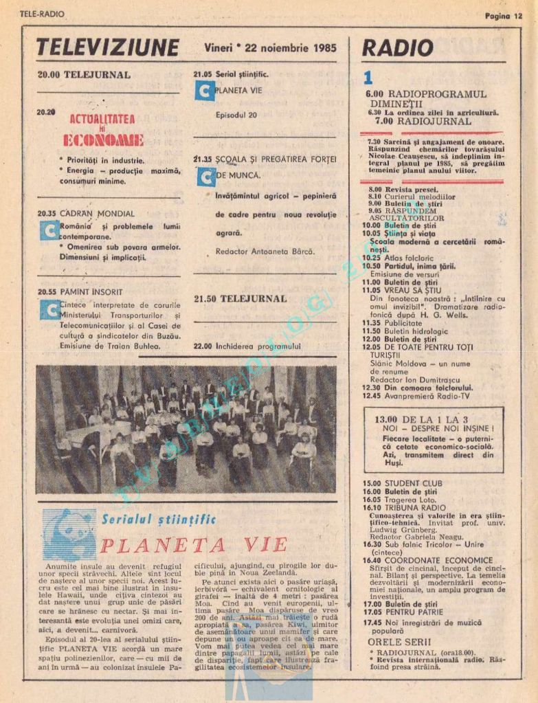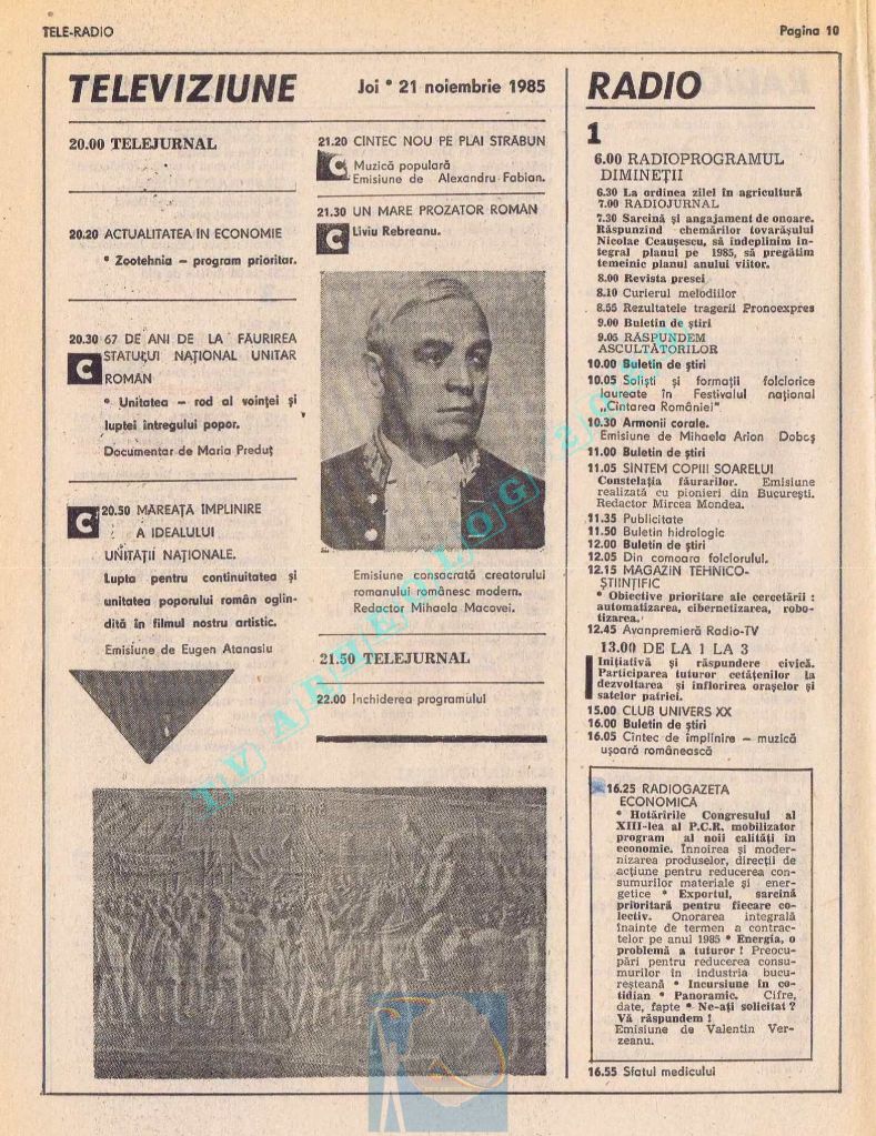 E singura dată când revista a apărut cu acest frontispiciu colorat în roșu. Poate că voiau să semnaleze momentele politice importante, așa cum revista „Săptămâna” avea o altă schemă de culori când comuniștii aveau ceva de sărbătorit. Acum, cred că au aniversat un an de la cel de-al XIII-lea congres al Partidului Comunist Român, care a început pe 19 noiembrie 1984. Posibil ca ulterior să fi abandonat ideea schimbării culorii frontispiciului, ea rămânând albastră până la ultima apariție din decembrie 1989.