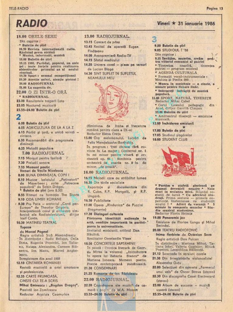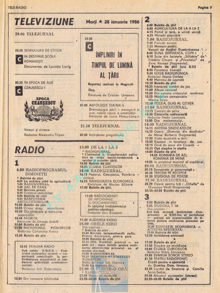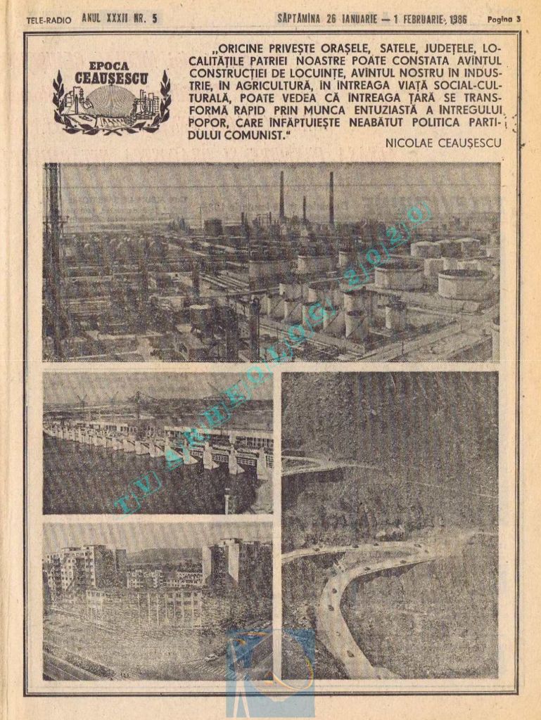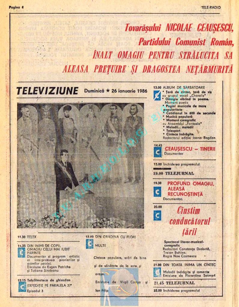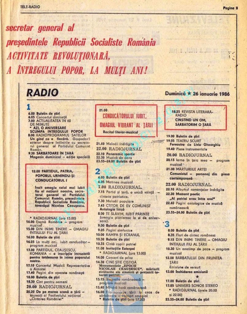 Pentru că ziua Tovarășului (duminică, 26 ianuarie 1986) ar fi trebuit tipărite alb-negru, paginile 2-3 au conținut fotografii cu „Ctitorii ale Epocii Ceaușescu”, iar zilele de luni și marți au fost înghesuite fiecare pe câte o singură pagină. Situația s-a repetat și la aniversarea din 1988. Toate aceste artificii tipografice pentru ca pe paginile din ziua de naștere a lui Ceaușescu să fie cât mai multă culoare roșie !