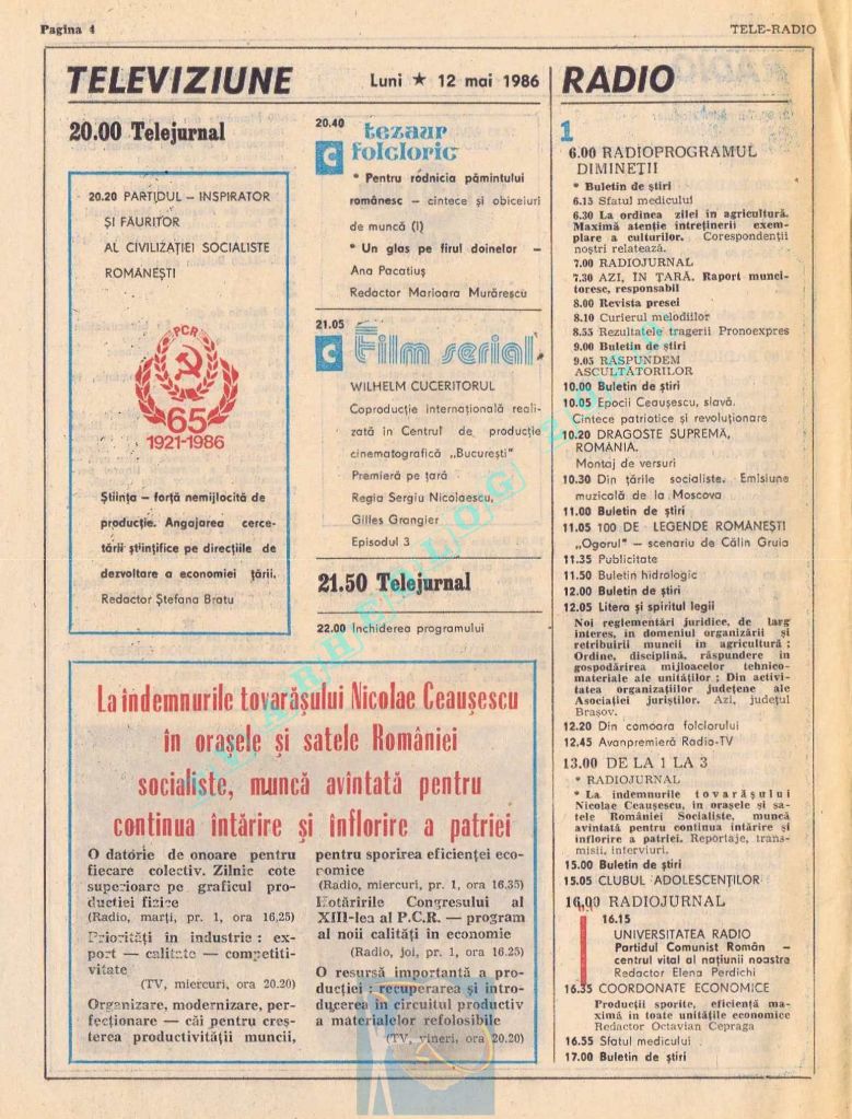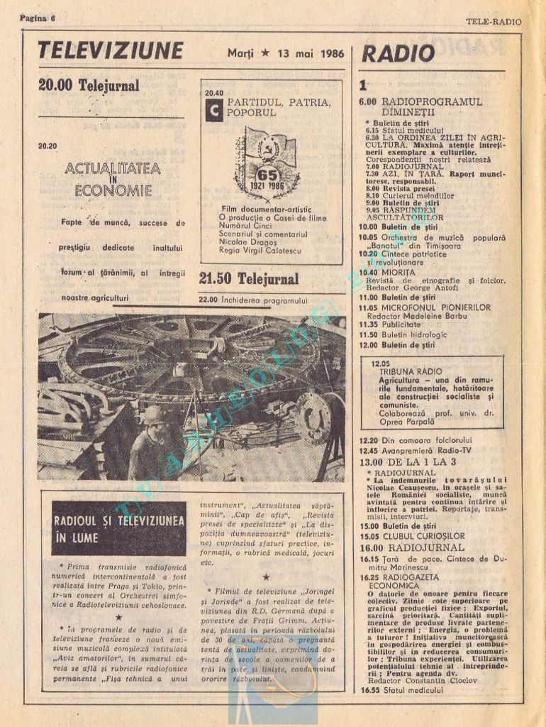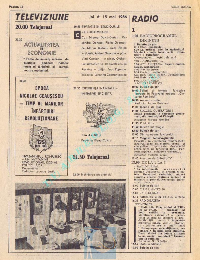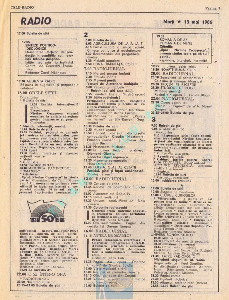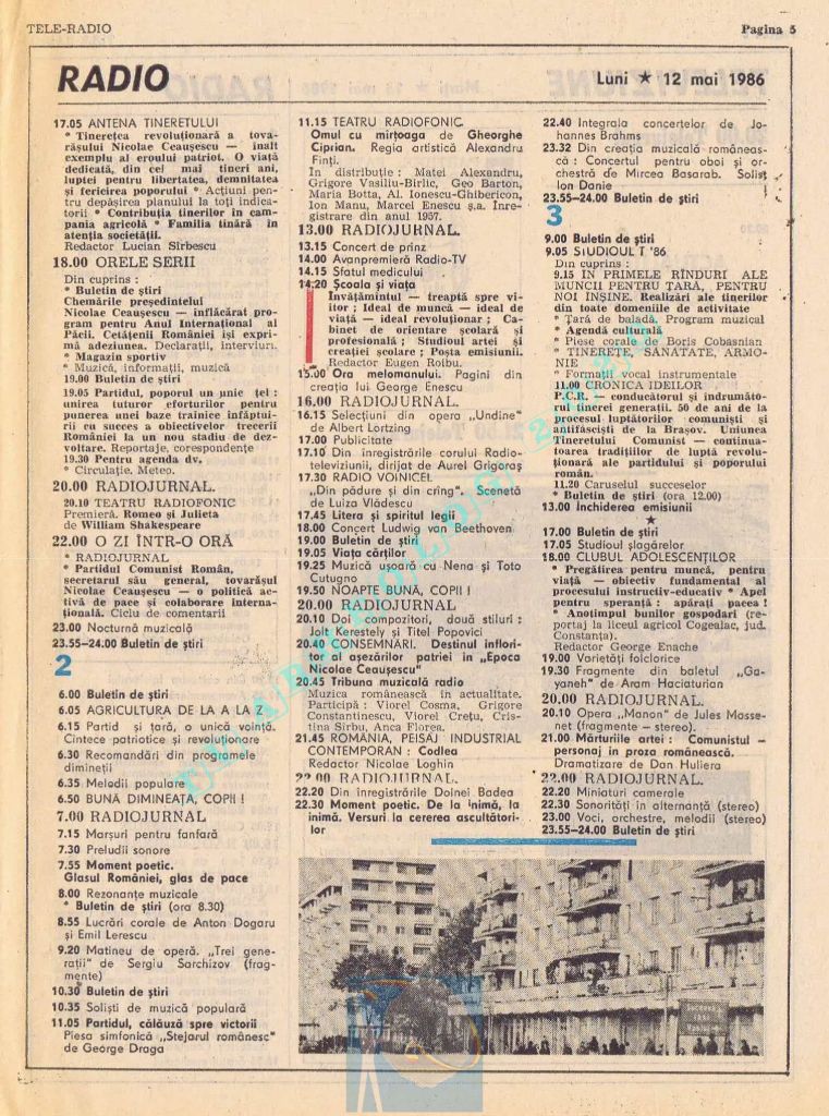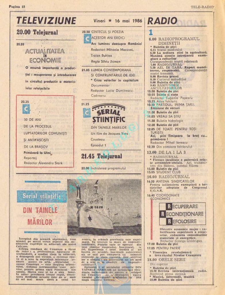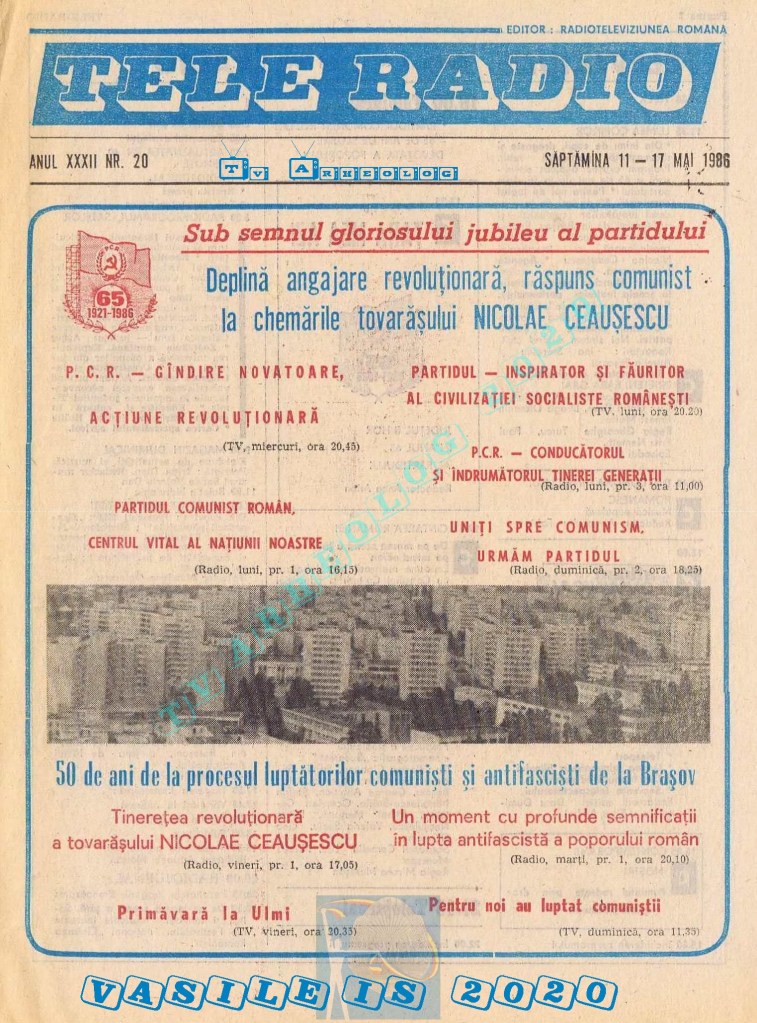 Titluri interesante în programul tv de vineri, 16 mai 1986: „Primăvară la Ulmi. 50 de ani de la Procesul luptătorilor comuniști și antifasciști de la Brașov” După numai un an, la 15 noiembrie 1987, muncitorii brașoveni vor fi anti-comuniști !!!. La ora 21:05, „Criza valorilor în capitalism”. Și ca o gură de oxigen, din acea vineri se va difuza serialul științific „Din tainele mărilor” realizat de Jacques Yves Cousteau.