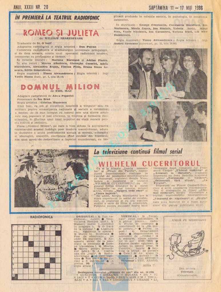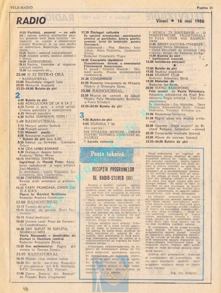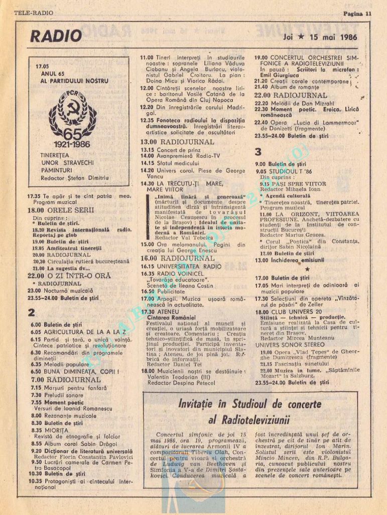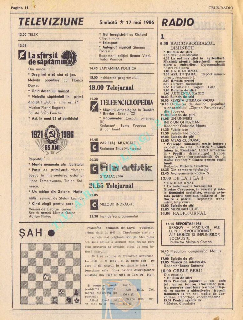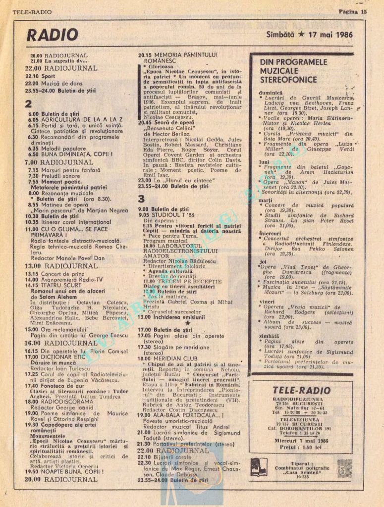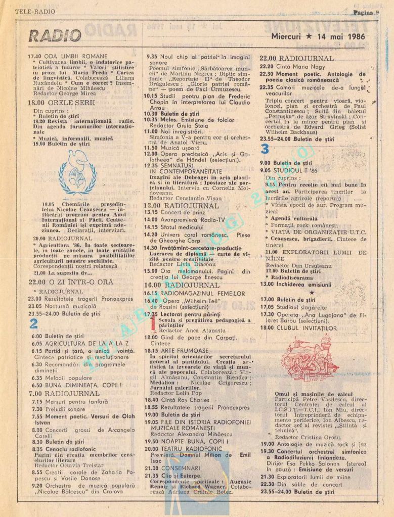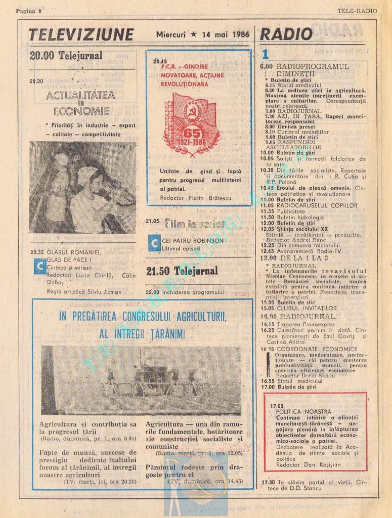 Titluri interesante în programul tv de vineri, 16 mai 1986: „Primăvară la Ulmi. 50 de ani de la Procesul luptătorilor comuniști și antifasciști de la Brașov” După numai un an, la 15 noiembrie 1987, muncitorii brașoveni vor fi anti-comuniști !!!. La ora 21:05, „Criza valorilor în capitalism”. Și ca o gură de oxigen, din acea vineri se va difuza serialul științific „Din tainele mărilor” realizat de Jacques Yves Cousteau.