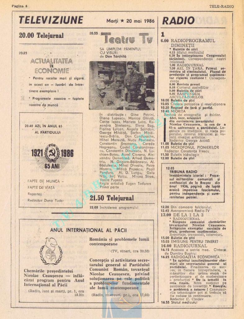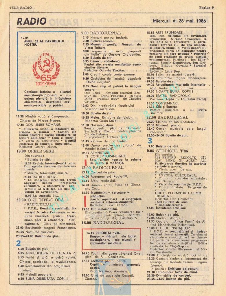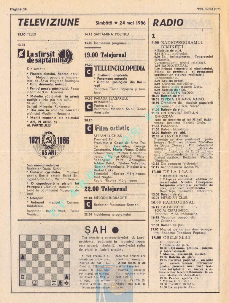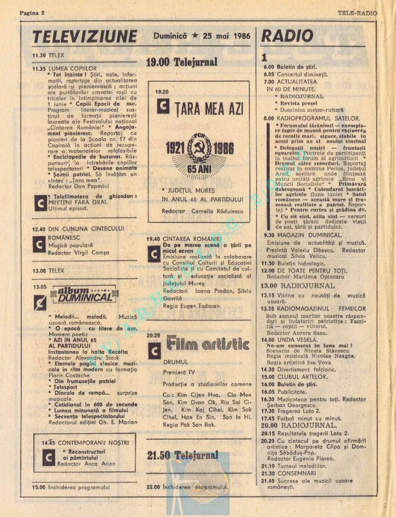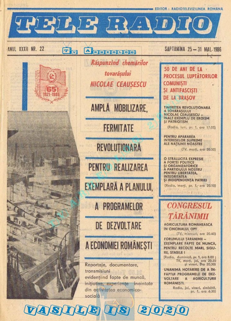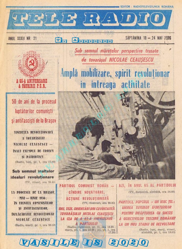 Ultimul jubileu al Partidului Comunist Român aduce modificări în paginația acestui număr: zilele de marți și miercuri înghesuite pe câte o pagină pentru a favoriza aniversarea a 65 de ani de la controversata dată de naștere a Partidului (8 mai 1921). Paginile 14 și 15 nu conțin programe radio-tv, ci avanpremiere și Poșta tehnică care primește un spațiu generos.