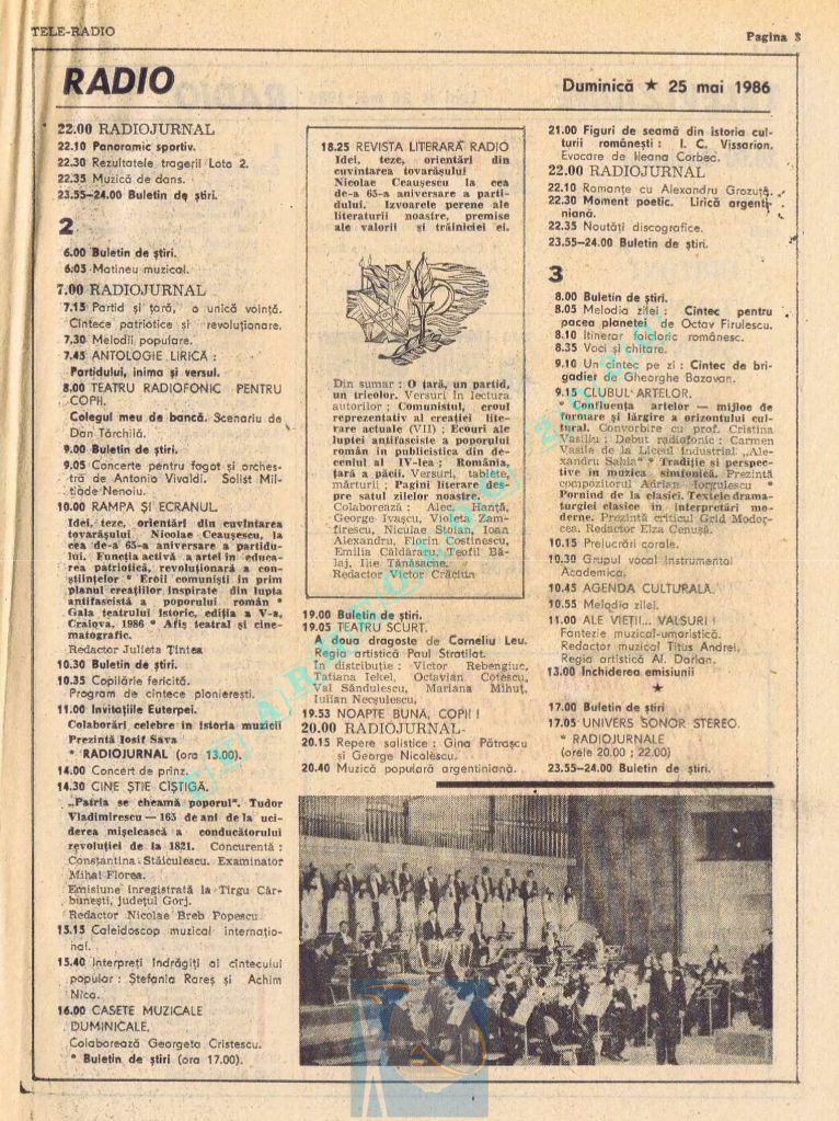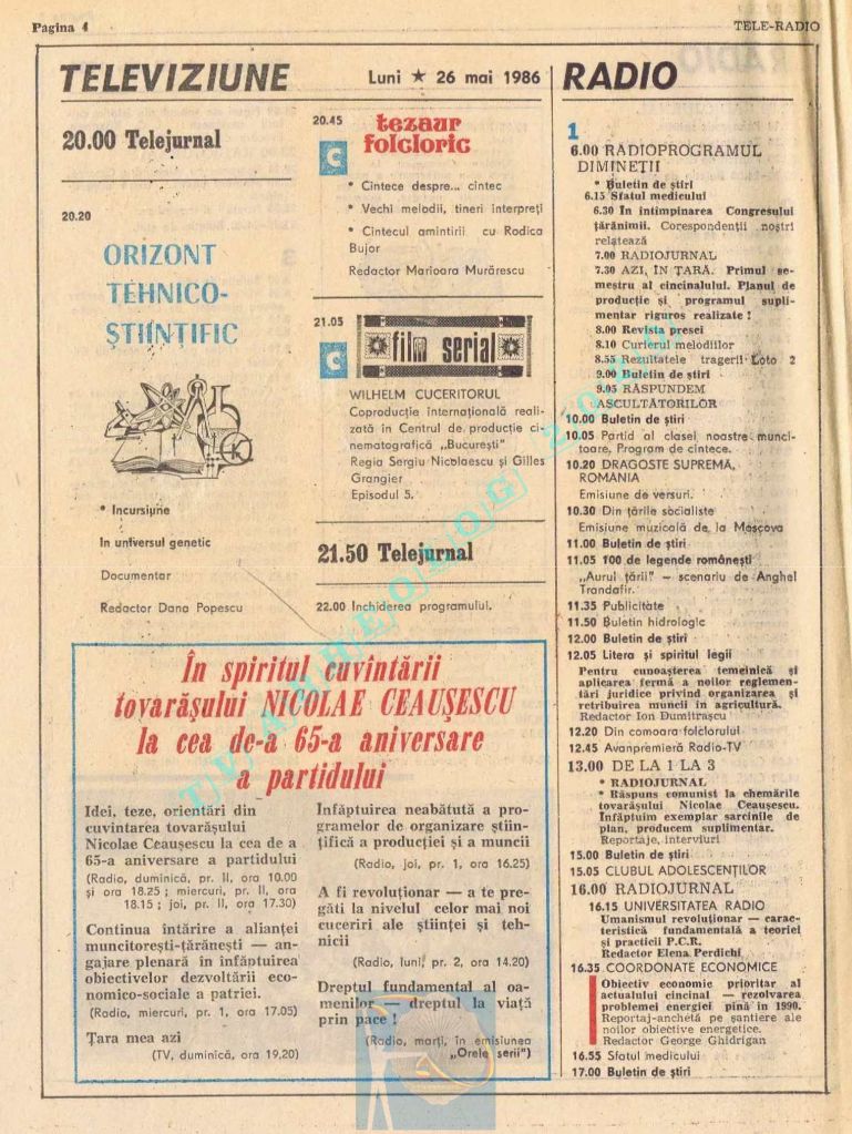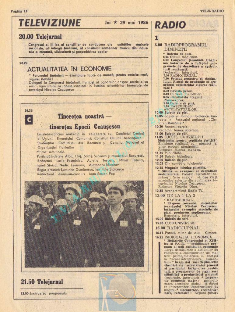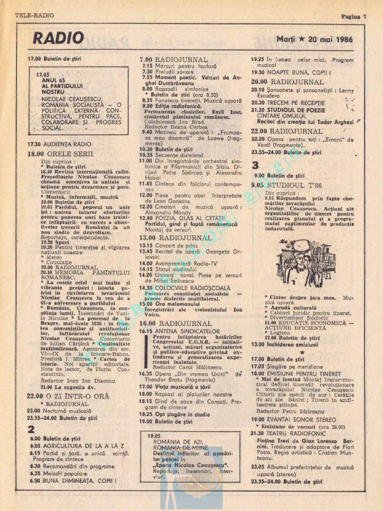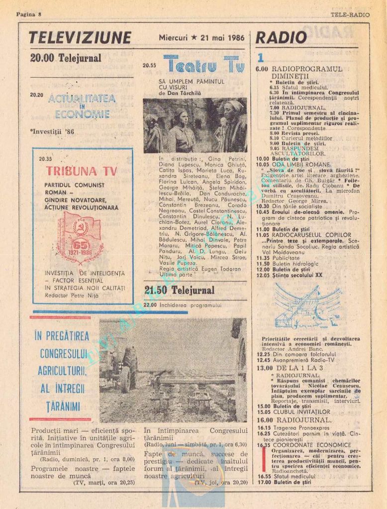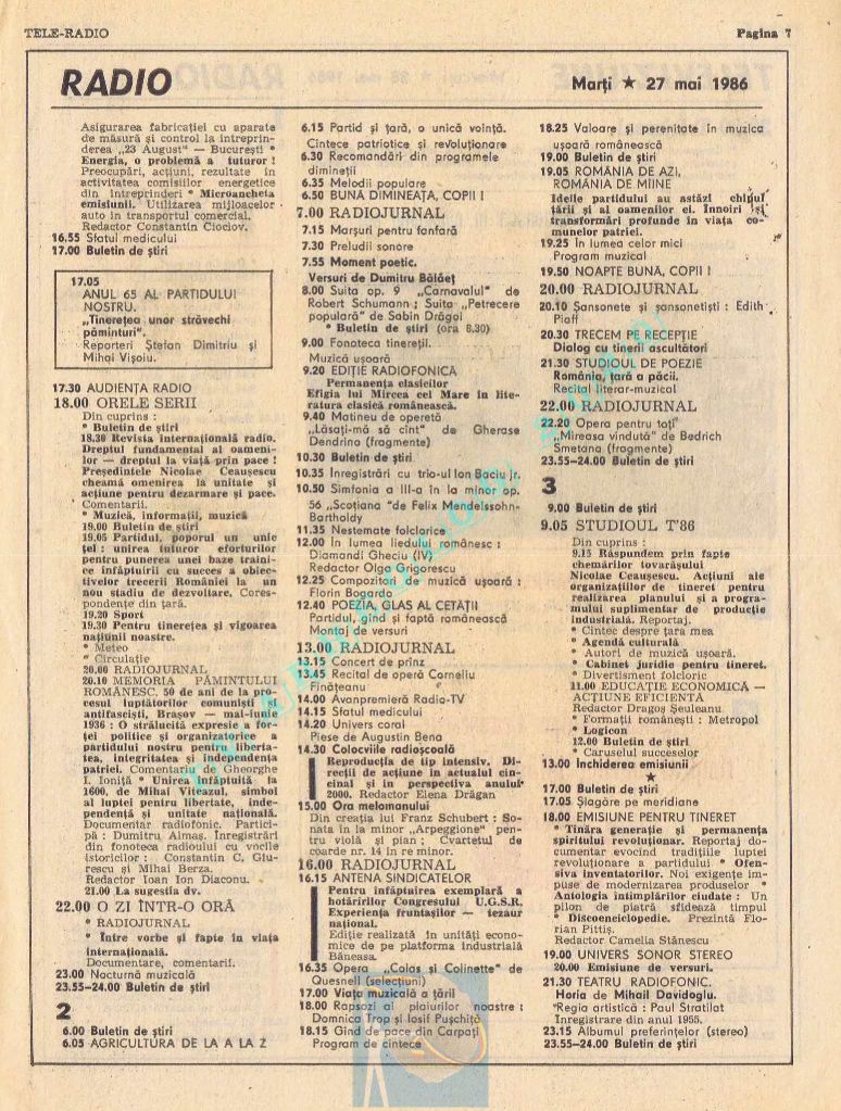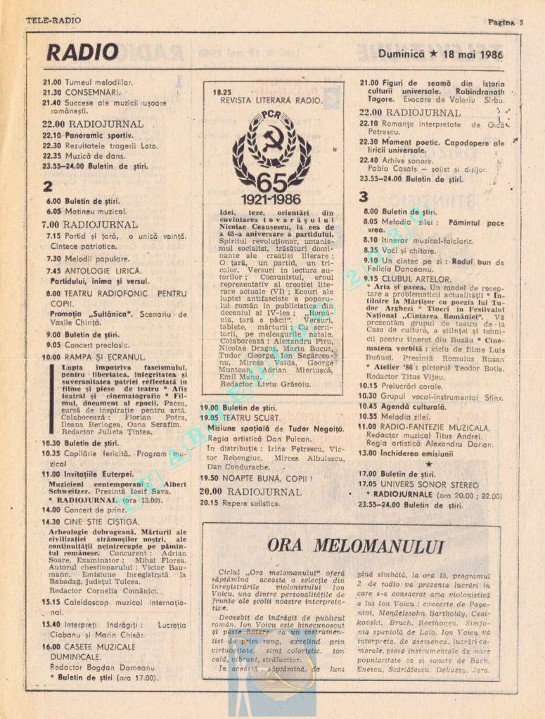 Ultimul jubileu al Partidului Comunist Român aduce modificări în paginația acestui număr: zilele de marți și miercuri înghesuite pe câte o pagină pentru a favoriza aniversarea a 65 de ani de la controversata dată de naștere a Partidului (8 mai 1921). Paginile 14 și 15 nu conțin programe radio-tv, ci avanpremiere și Poșta tehnică care primește un spațiu generos.