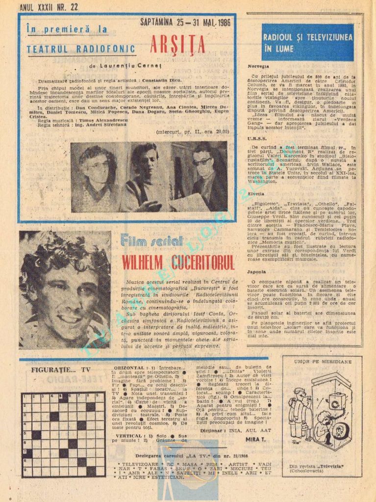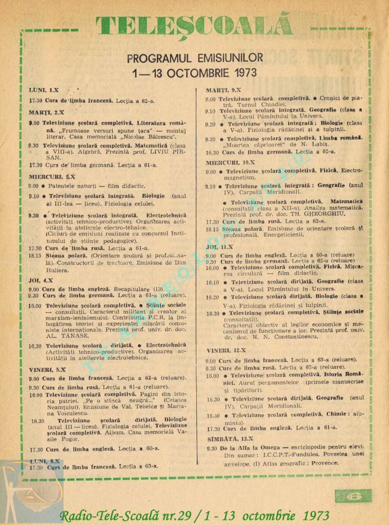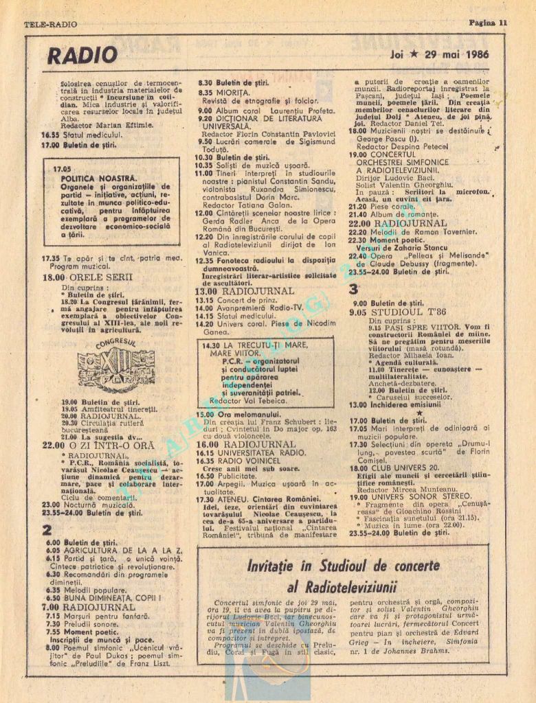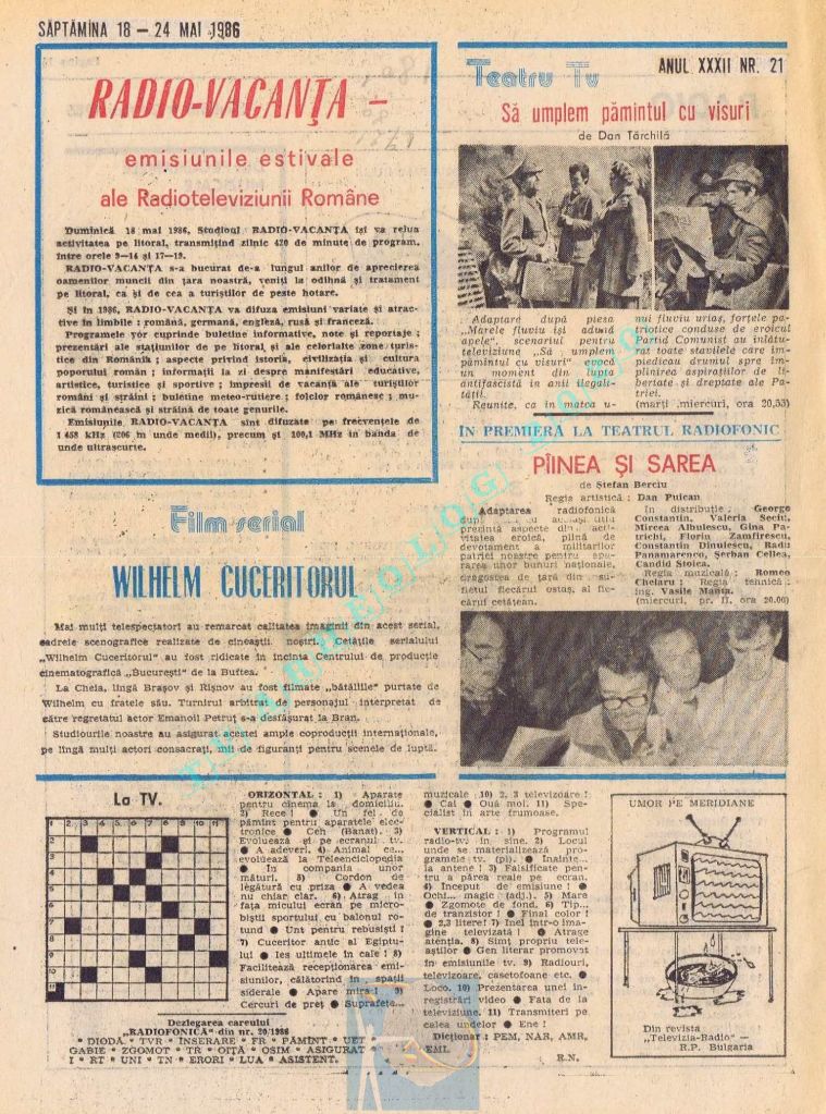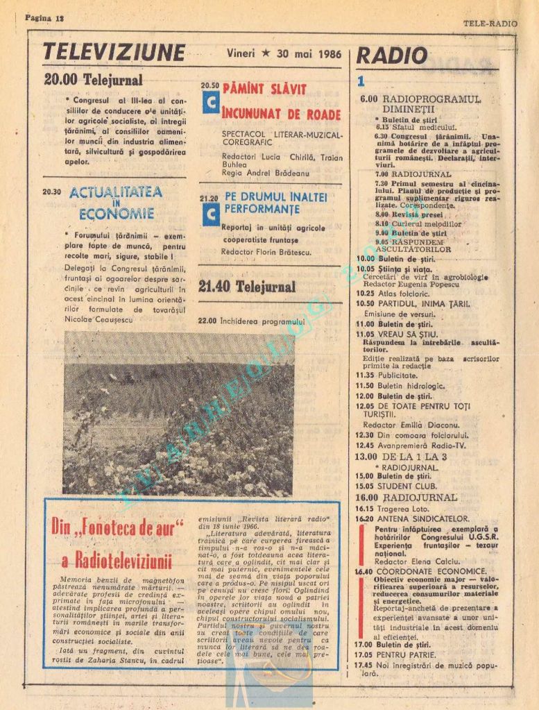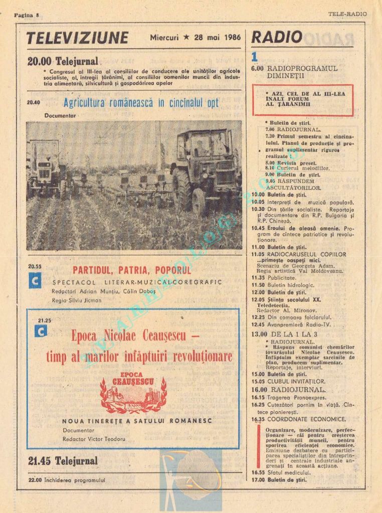 Ultimul jubileu al Partidului Comunist Român aduce modificări în paginația acestui număr: zilele de marți și miercuri înghesuite pe câte o pagină pentru a favoriza aniversarea a 65 de ani de la controversata dată de naștere a Partidului (8 mai 1921). Paginile 14 și 15 nu conțin programe radio-tv, ci avanpremiere și Poșta tehnică care primește un spațiu generos.