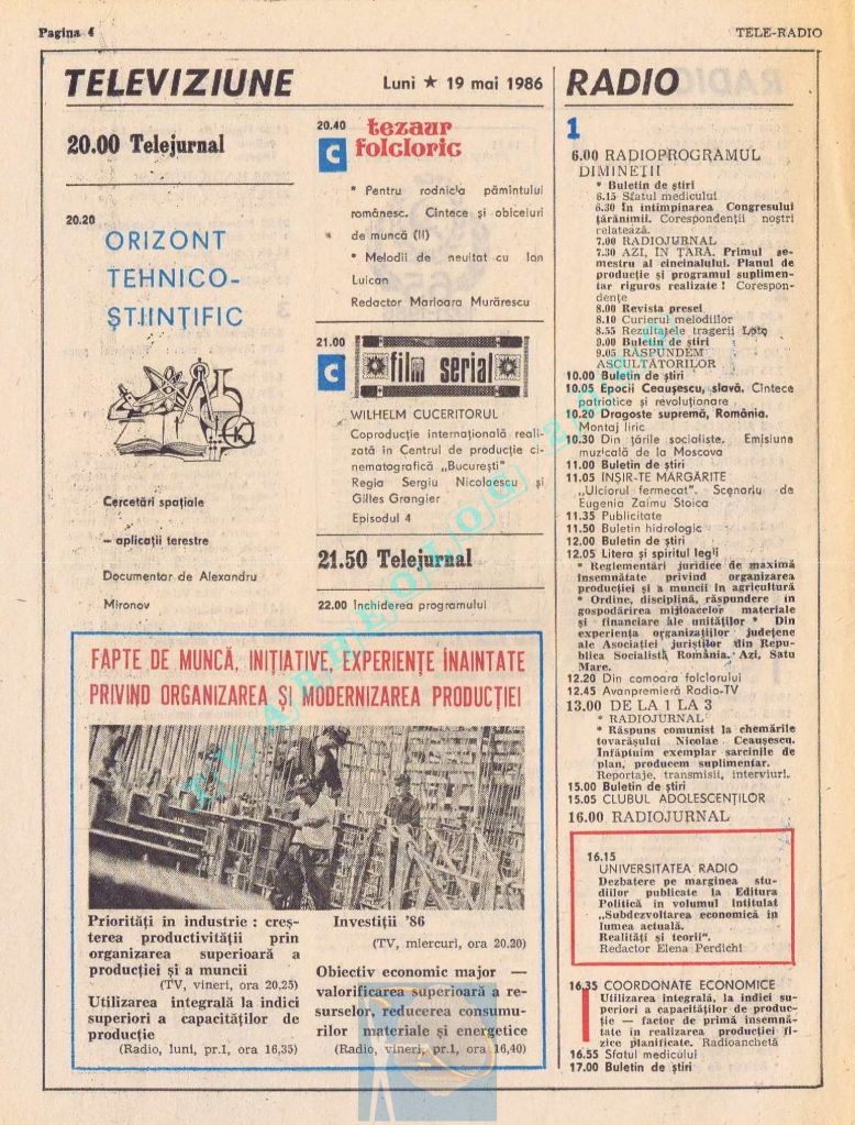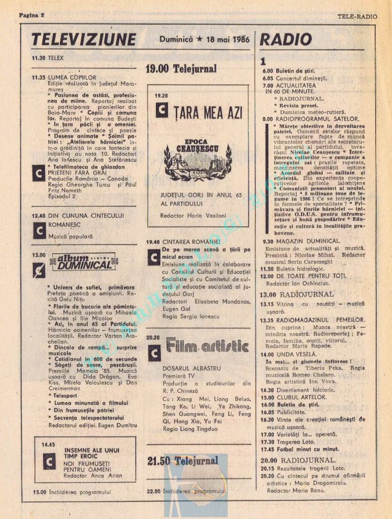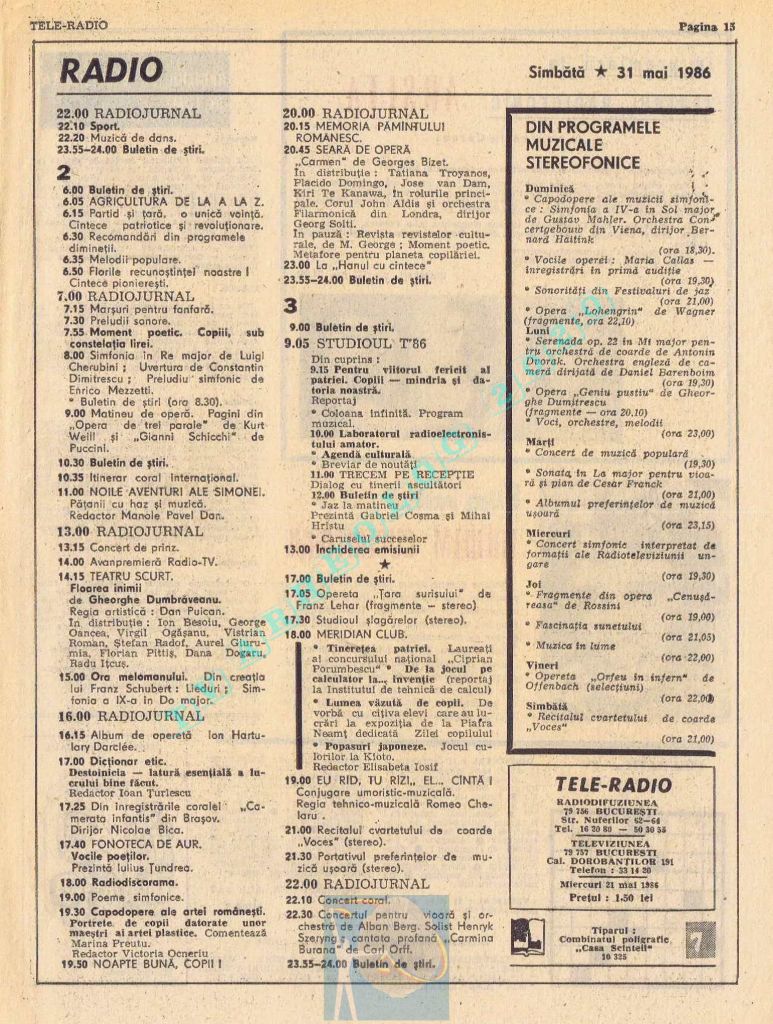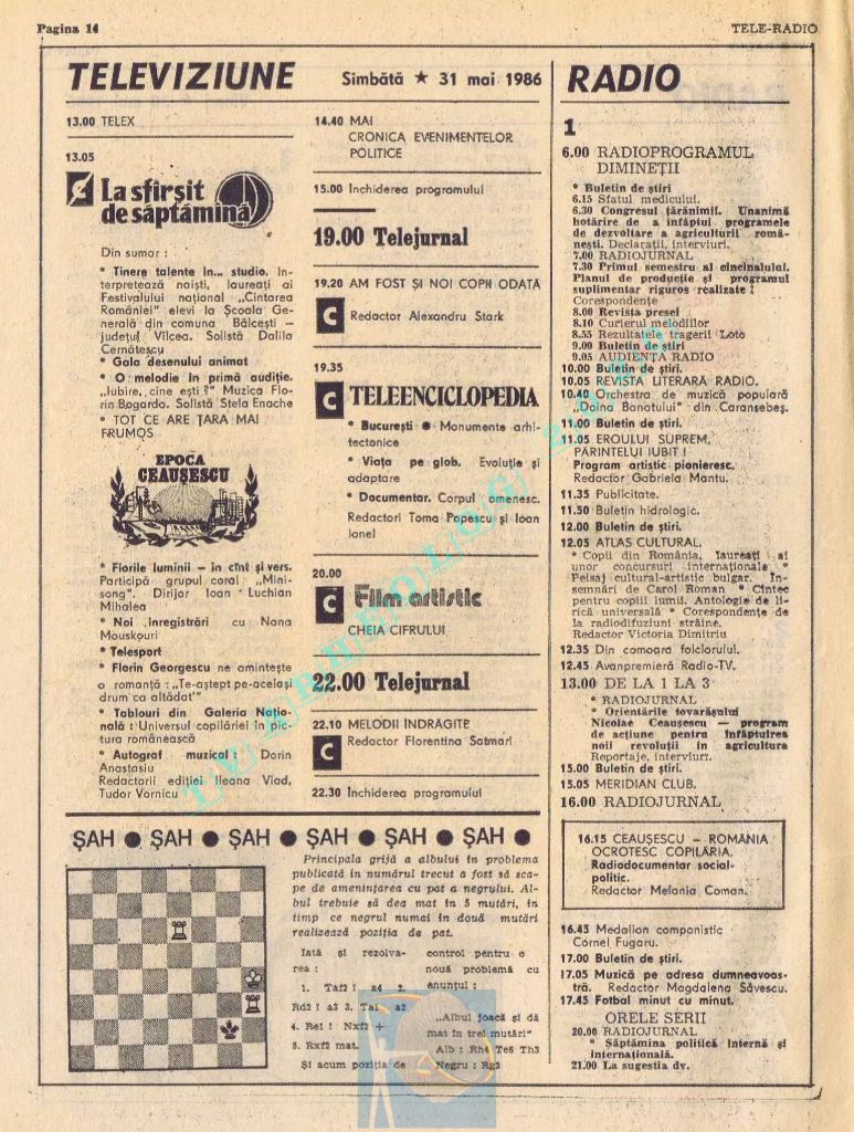Număr festiv care, pentru a pune la loc de cinste Ziua Muncii în pagini cu multă culoare roșie și albastră, a înghesuit zilele de marți și miercuri pe câte o pagină, iar pe spațiul rămas liber din paginile 14-15 au folosit articole de umplutură. Țara se pregătea de a 65-a aniversare, dar asta se va întâmpla pe 8 mai 1986, adică în numărul următor, care va avea același tip de paginație și aceleași ilustrații spectaculoase pe prima pagină. Joi, 1 mai 1986, program continuu de 12 ore, de la 11.00 la 23.00, iar joi, 2 mai 1986, program de duminică (11.30-15.00 și 19.00-22.00)