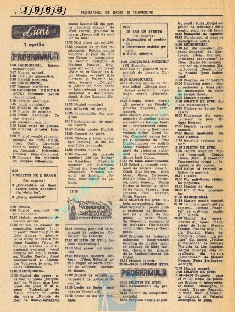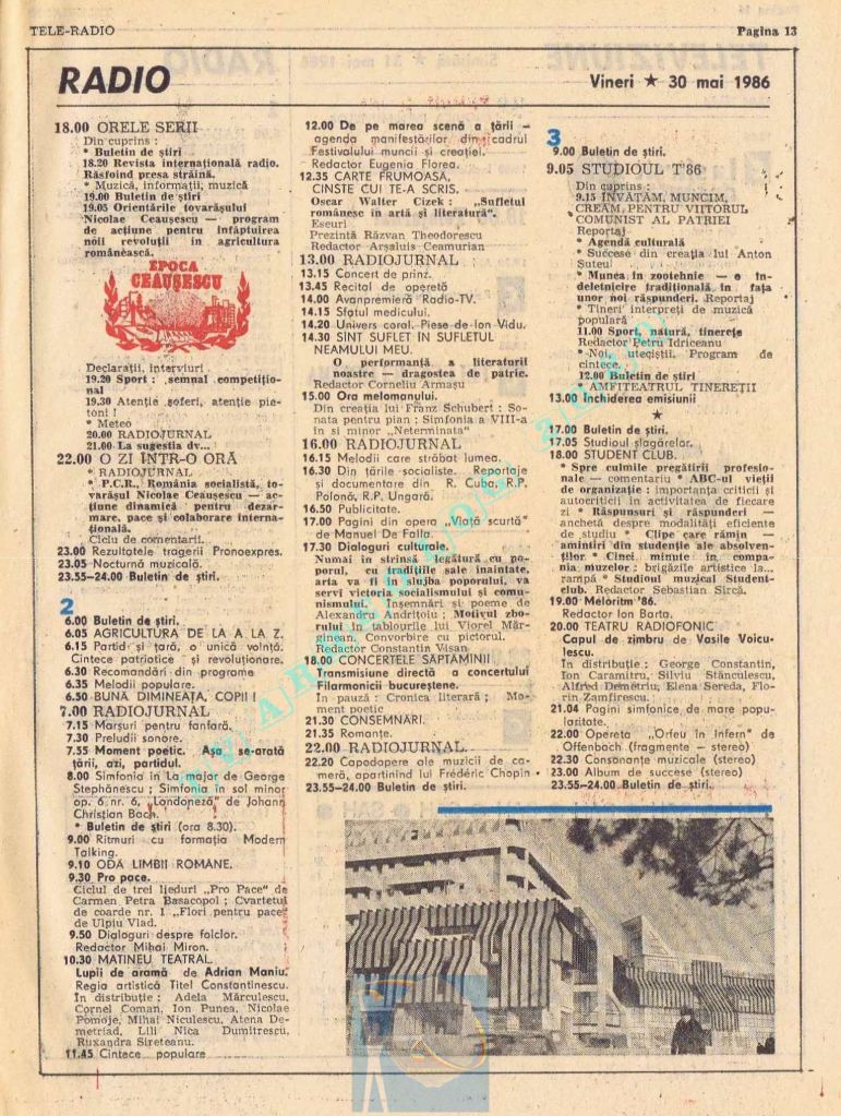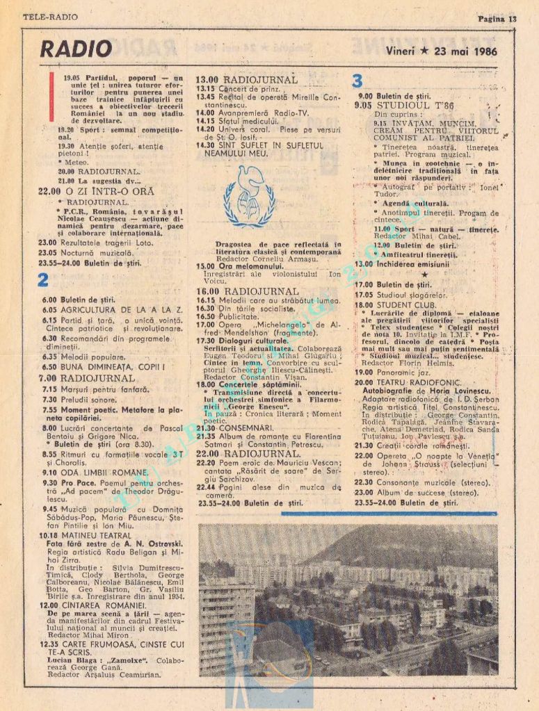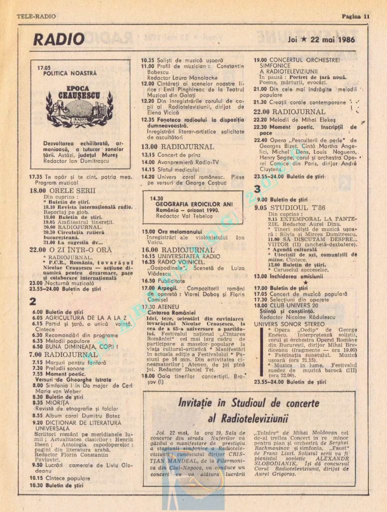 Număr festiv care, pentru a pune la loc de cinste Ziua Muncii în pagini cu multă culoare roșie și albastră, a înghesuit zilele de marți și miercuri pe câte o pagină, iar pe spațiul rămas liber din paginile 14-15 au folosit articole de umplutură. Țara se pregătea de a 65-a aniversare, dar asta se va întâmpla pe 8 mai 1986, adică în numărul următor, care va avea același tip de paginație și aceleași ilustrații spectaculoase pe prima pagină. Joi, 1 mai 1986, program continuu de 12 ore, de la 11.00 la 23.00, iar joi, 2 mai 1986, program de duminică (11.30-15.00 și 19.00-22.00)