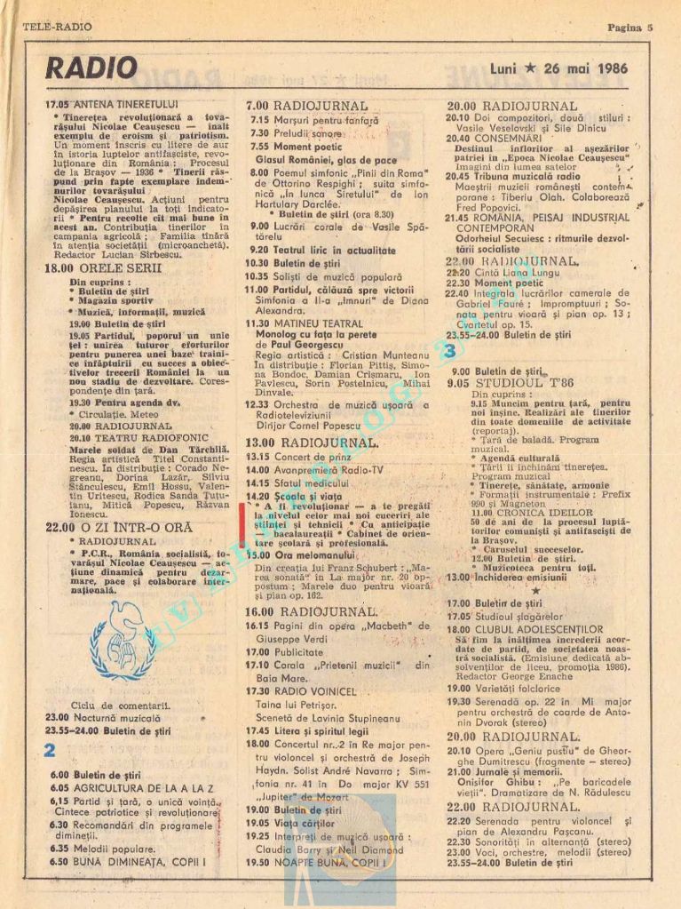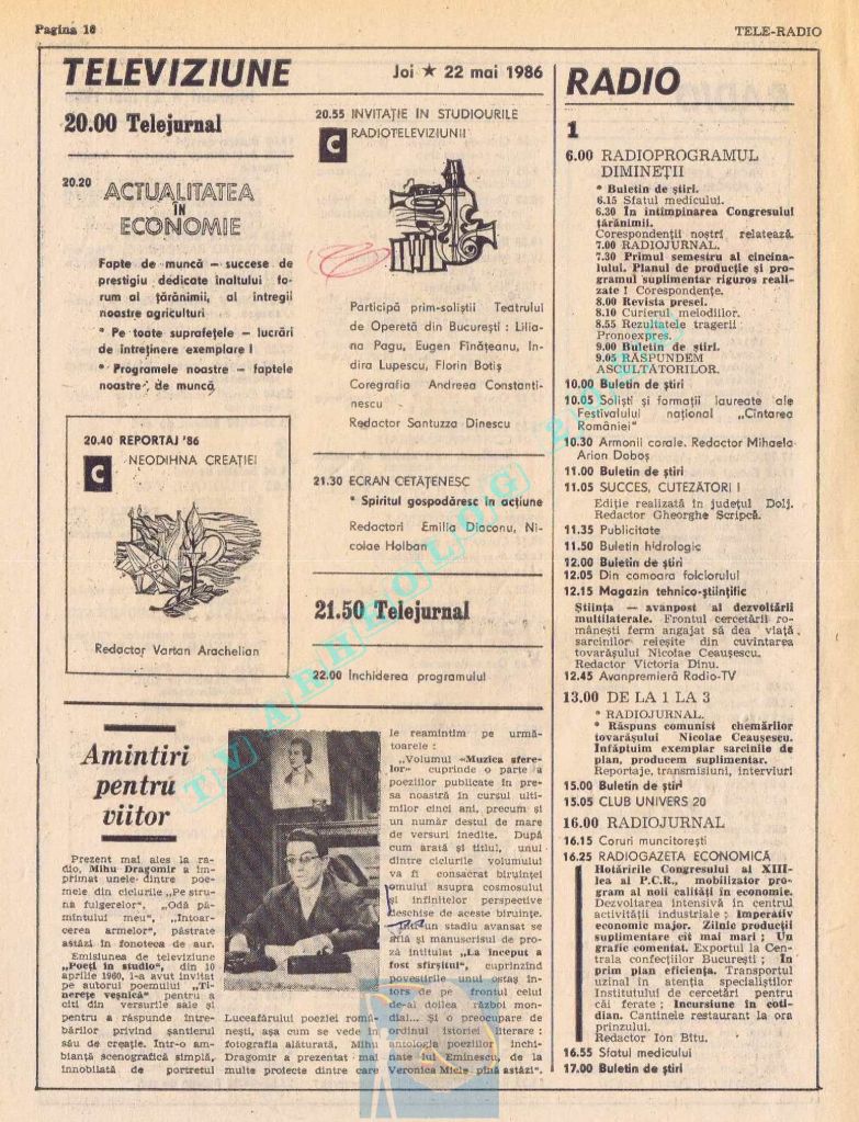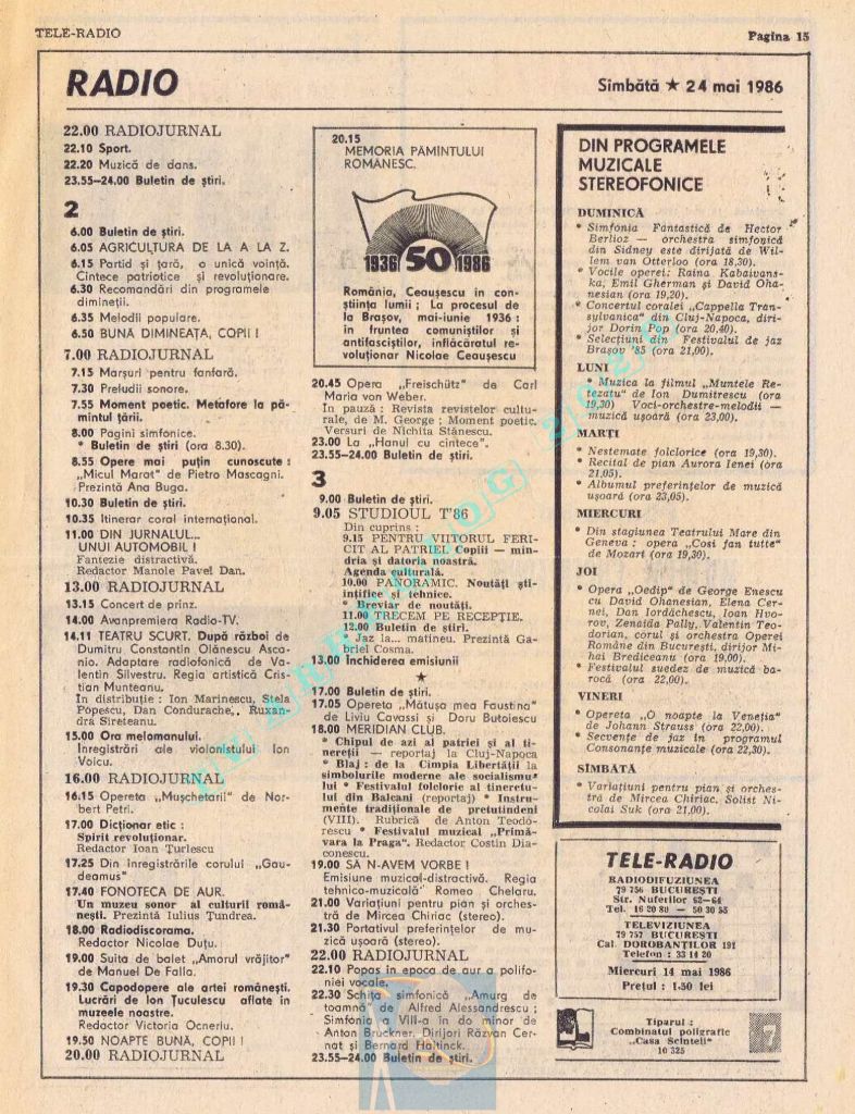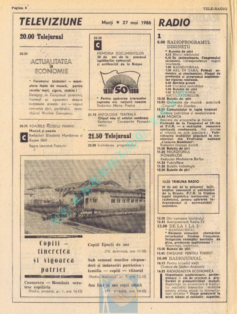 Titluri interesante în programul tv de vineri, 16 mai 1986: „Primăvară la Ulmi. 50 de ani de la Procesul luptătorilor comuniști și antifasciști de la Brașov” După numai un an, la 15 noiembrie 1987, muncitorii brașoveni vor fi anti-comuniști !!!. La ora 21:05, „Criza valorilor în capitalism”. Și ca o gură de oxigen, din acea vineri se va difuza serialul științific „Din tainele mărilor” realizat de Jacques Yves Cousteau.