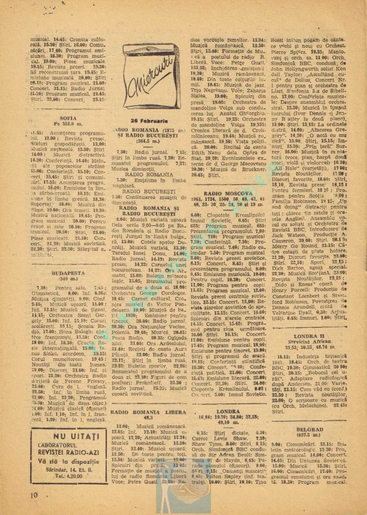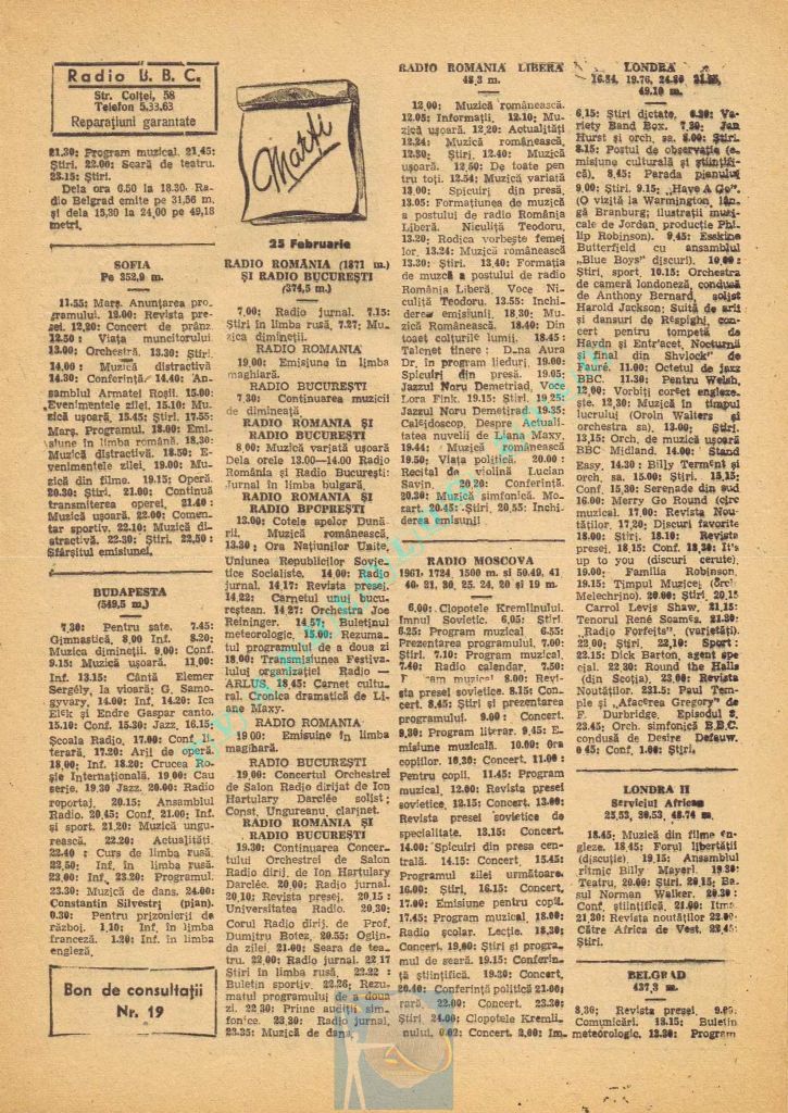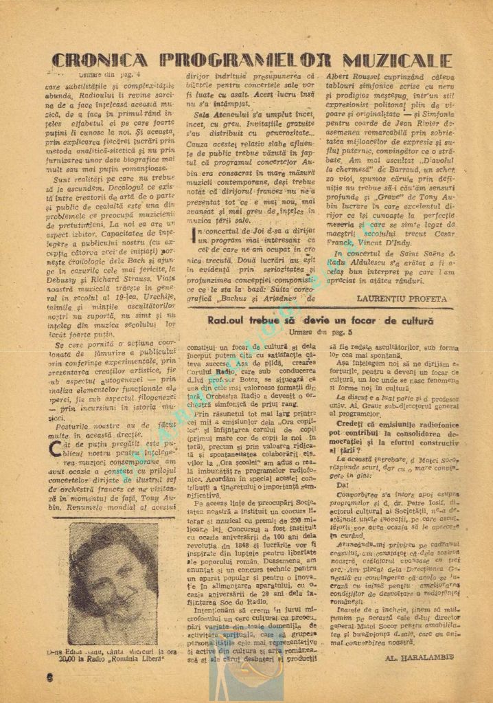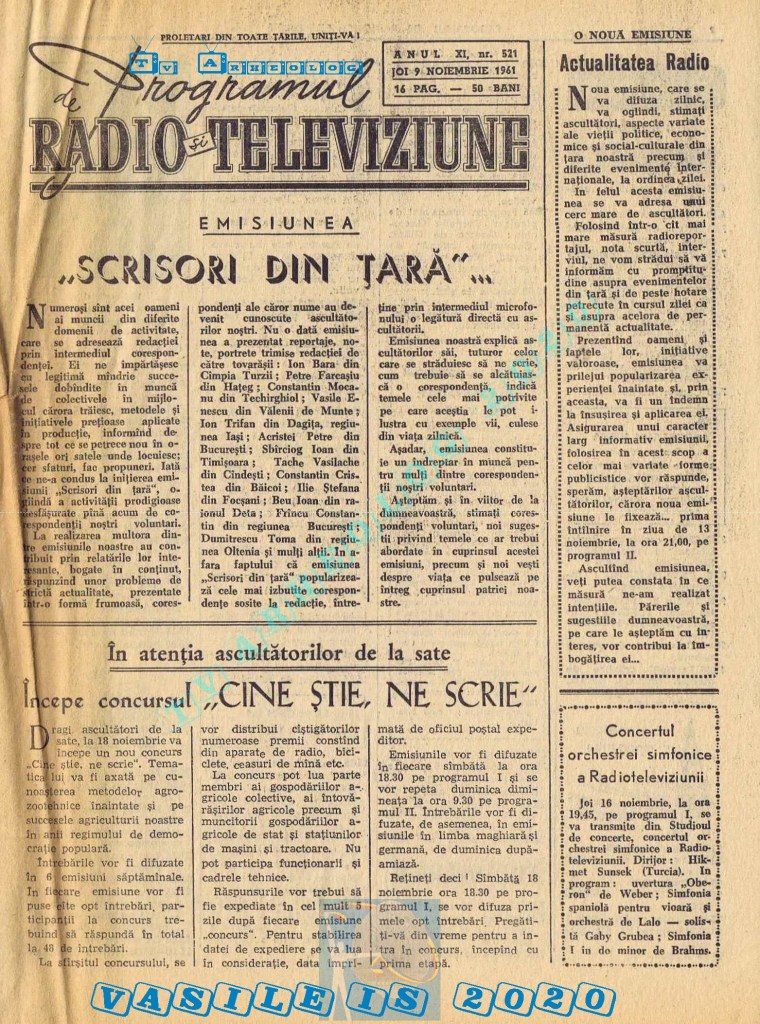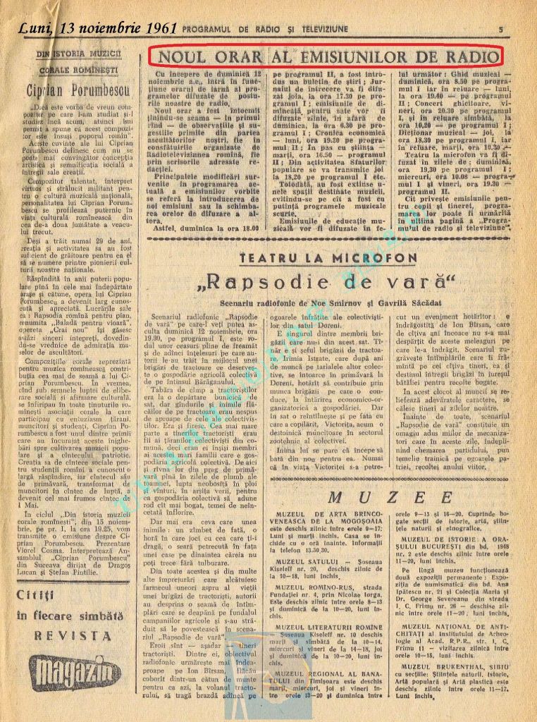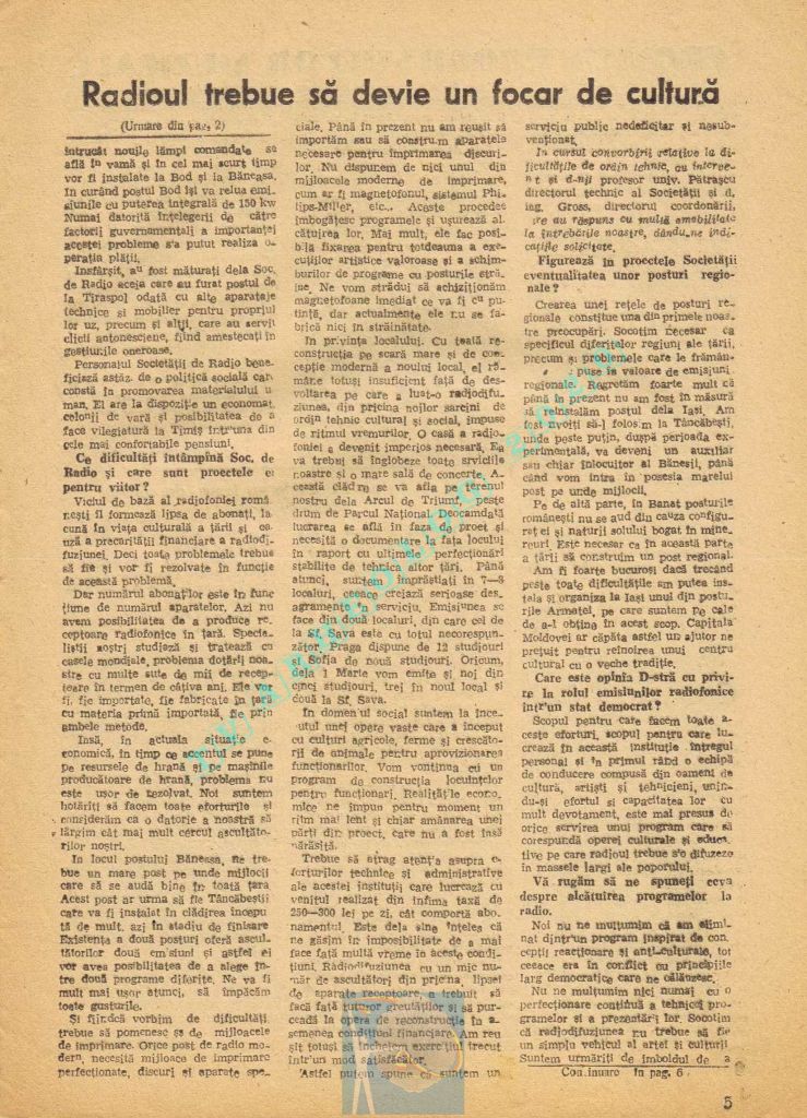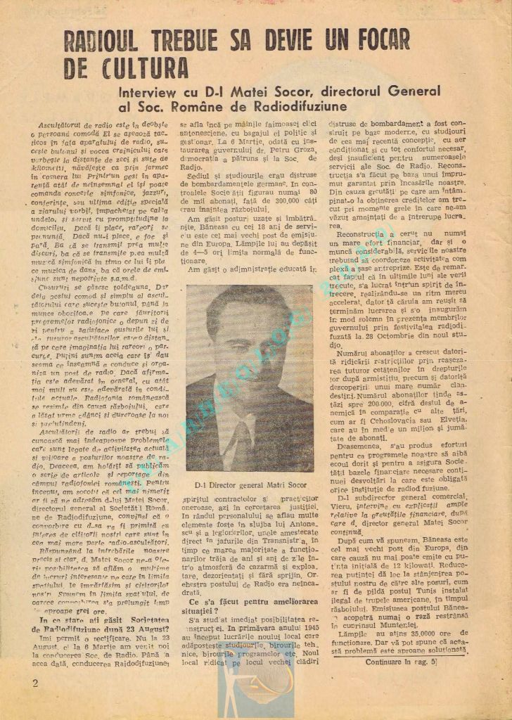 Extrem de interesant interviul dat de către directorul general al Societății Române de Radiodifuziune, Matei Socor în paginile 2,5 și 6 sub titlul „Radioul trebuie să devină un focar de cultură”. Îl aveți integral în format text, pentru că e o pagină de istorie prin numeroasele date oferite. M-a amuzat clasică vină a „vechii moșteniri”, a „clicii antonesciene”. Un articol despre Matei Socor ca director al Radioului găsiți la adresa https://www.historia.ro/sectiune/general/articol/matei-socor-primul-presedinte-comunist-al-radioului.