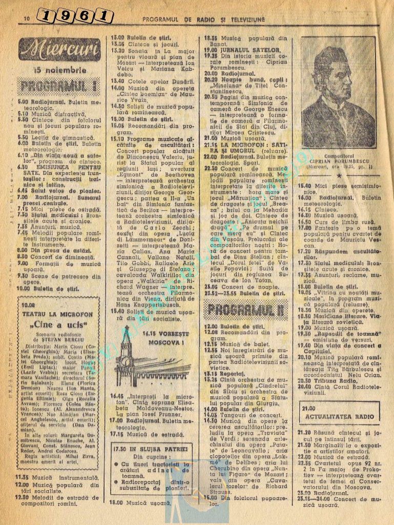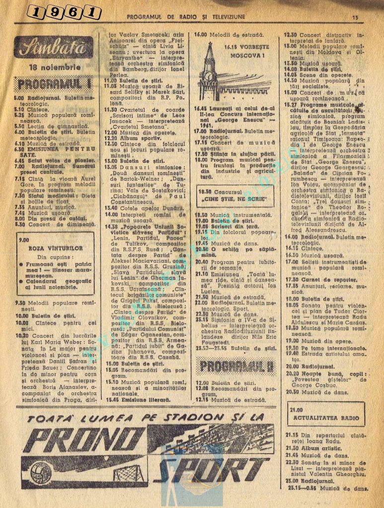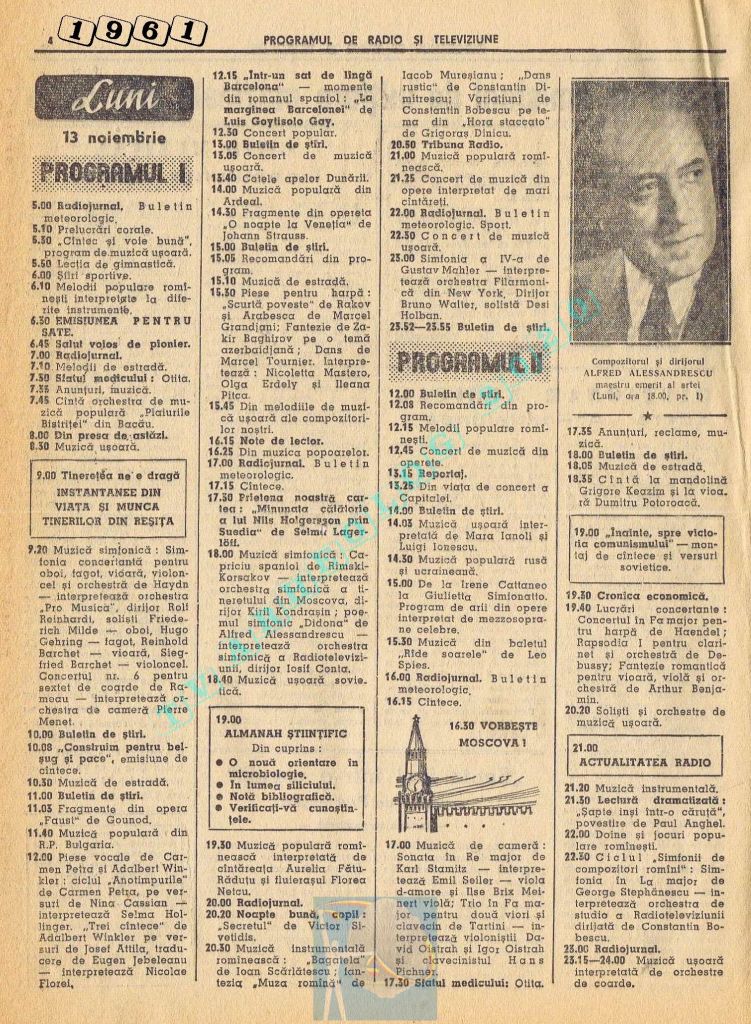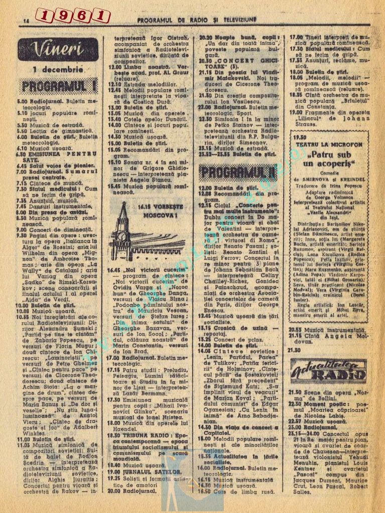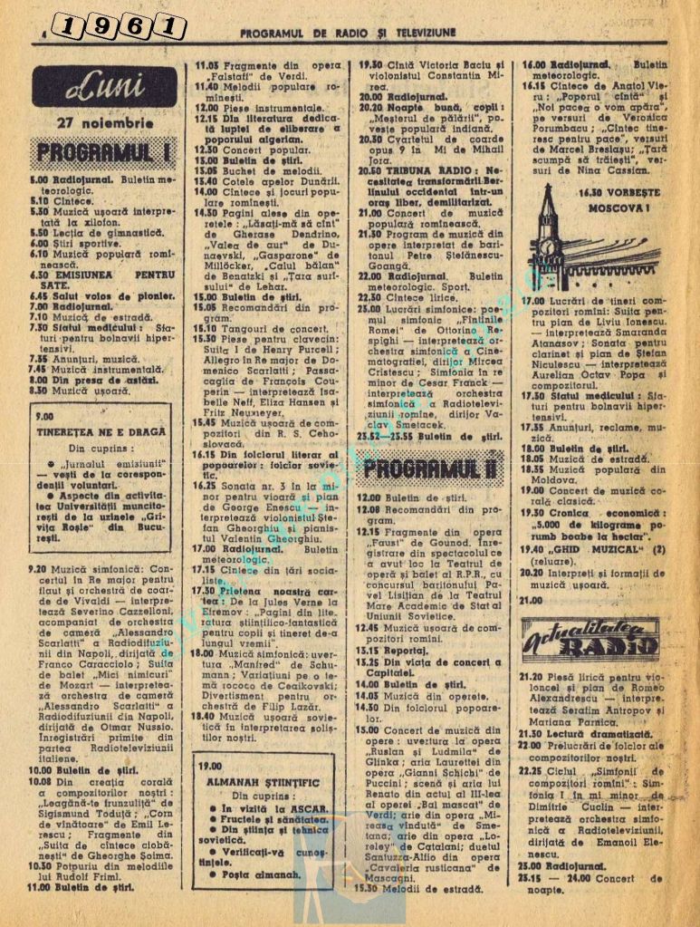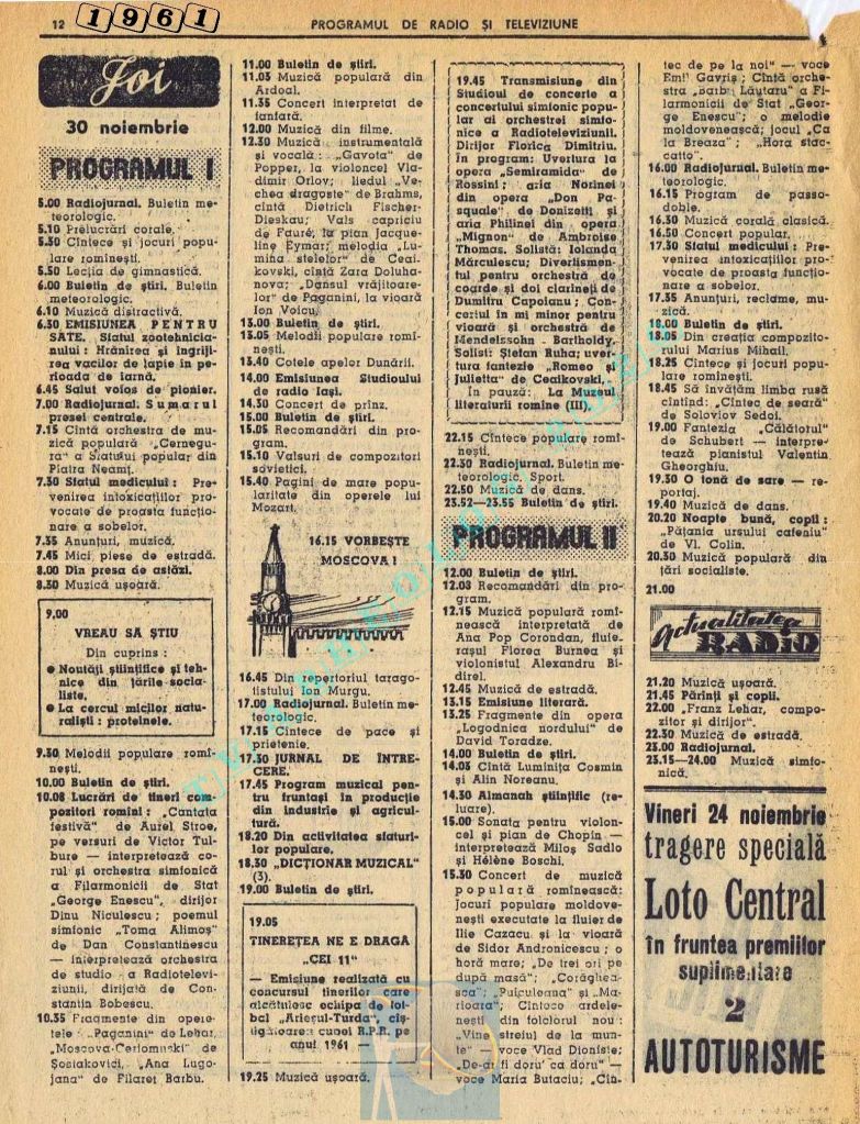 Nici o referire în tot cuprinsul revistei referitor la Ziua Unirii. Nici măcar în ziua de vineri, 1 decembrie 1961. Singurul lucru care iese în evidență este vigneta imperativ-vocativă „VORBEȘTE MOSCOVA!” La Televiziune nu se pune problema, deoarece s-a nimerit ca 1 decembrie să fie exact în ziua de pauză a Televiziunii din Moliere.
