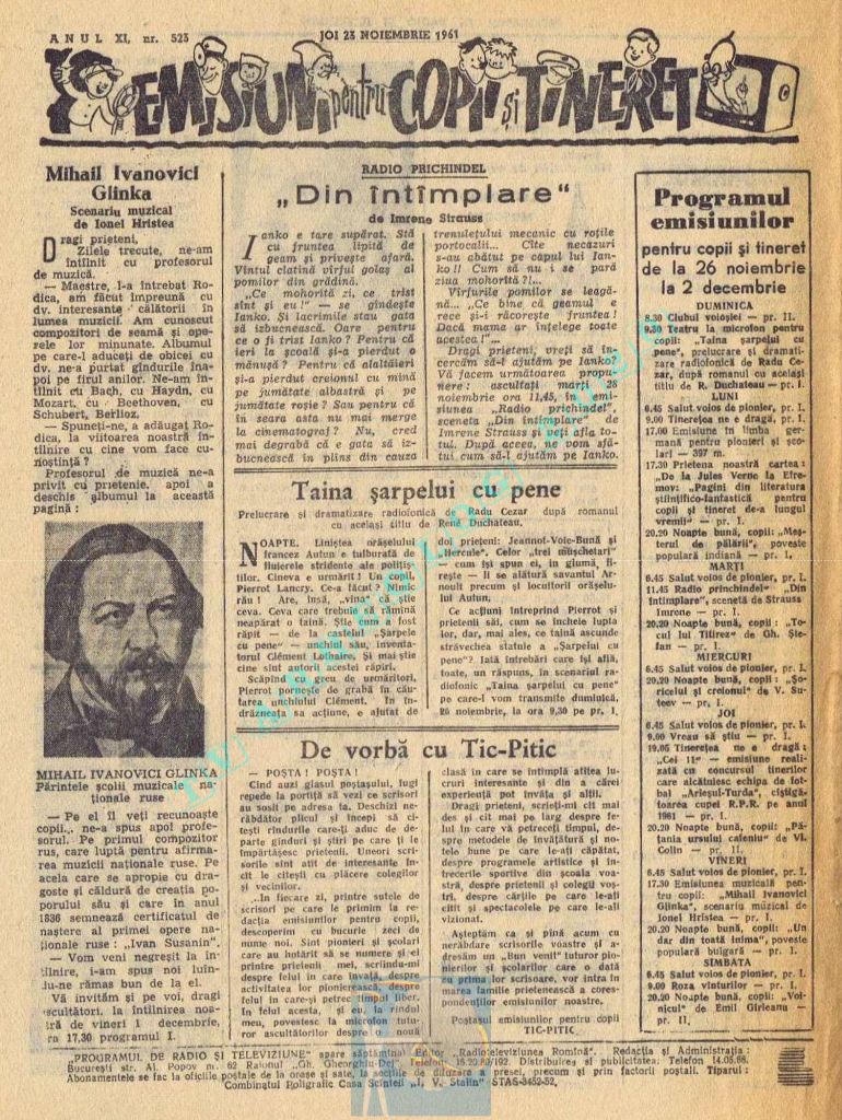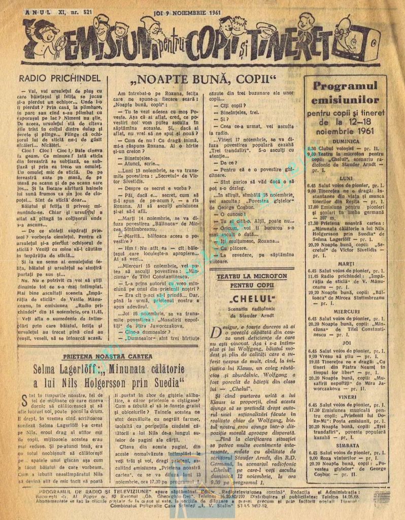 Prin răsunetul tot mai larg printre cei mici a emisiunilor de la „Ora copiilor” și înființarea corului de copii (primul mare cor de copii la noi în țară), precum și prin valoarea ridicată și spontaneitatea colaborării elevilor la „Ora școlii” am adus o reală îmbunătățire programelor radiofonice. Acordăm în special acestei contribuții a tineretului o importanță semnificativă.