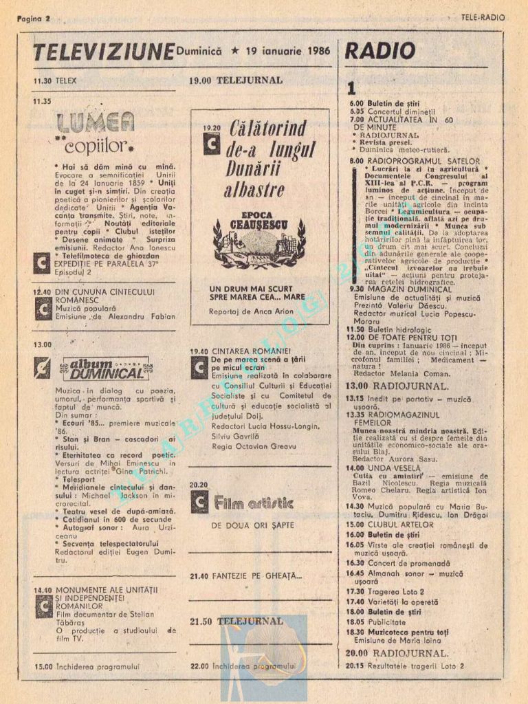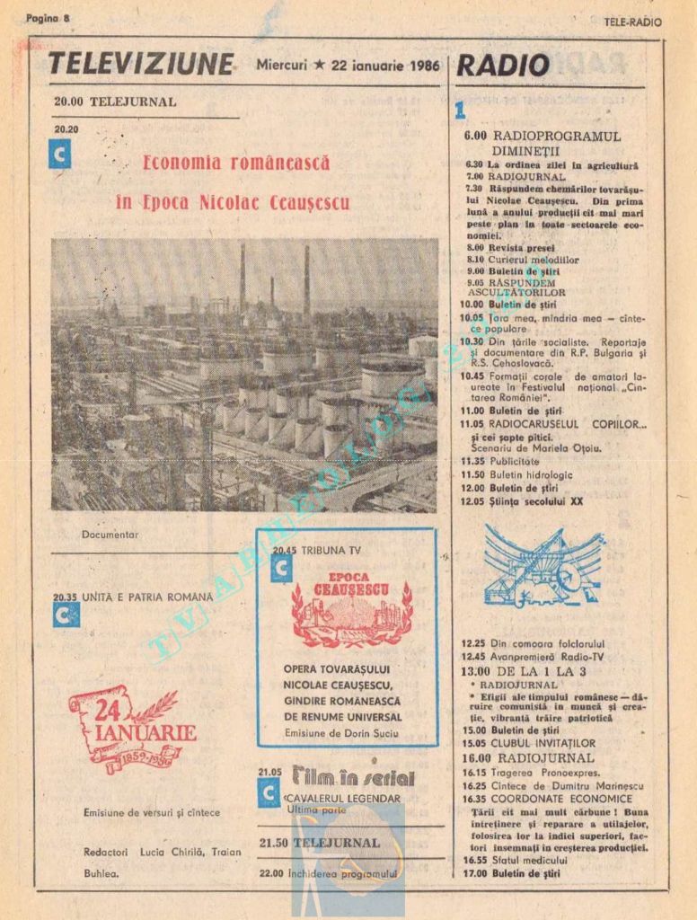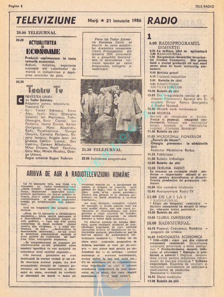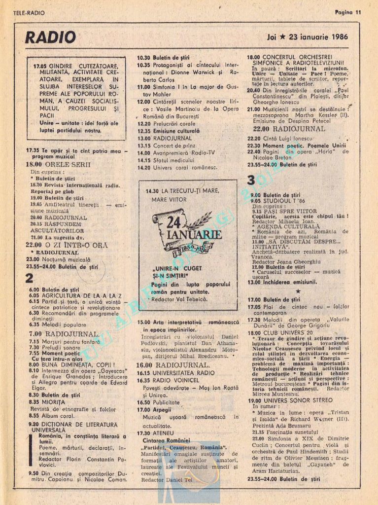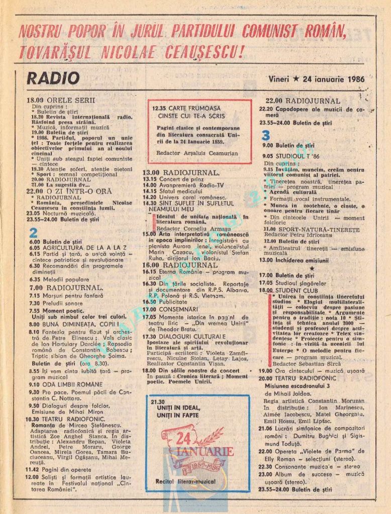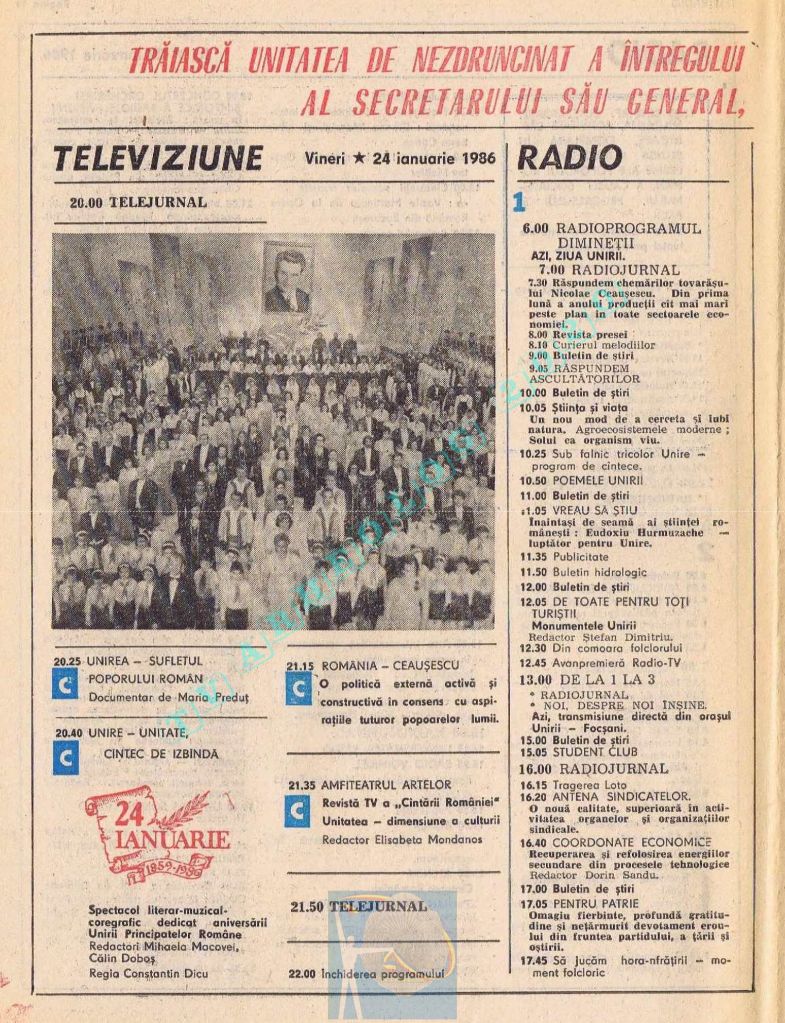 Vineri, 24 ianuarie 1986, de Ziua Unirii programul tipărit titra cu fond roșu o lozincă mare pe două pagini: „Trăiască unitatea de nezdruncinat a întregului nostru popor în jurul Partidului Comunist Român, al secretarului său general, tovarășul Nicolae Ceaușescu!” 😁