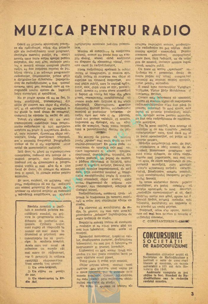 Pe aceeași linie de preocupări, Societatea noastră a instituit un concurs literar și muzical cu premii de 250 de milioane lei. Concursul a fost instituit cu ocazia aniversării a 100 de ani de la Revoluția de la 1848 și lucrările vor fi inspirate din luptele pentru libertate ale poporului român. Deasemeni, am anunțat și un concurs tehnic pentru un aparat popular și pentru o inovație în alimentarea aparatului, cu ocazia aniversării a 20 de ani de la înființarea Societății de Radio.