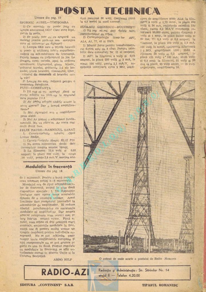 După cum vă spuneam, Băneasa este cel mai vechi post din Europa, din care cauză nu mai poate emite cu putința inițială de 12 kilowați. Reducerea putinței dă loc la stânjenirea postului nostru de către alte posturi, cum ar fi, de pildă, postul Tunis instalat ilegal de trupele americane, în timpul războiului. Emisiunea postului Băneasa acoperă numai o rază restrânsă în cuprinsul Munteniei.