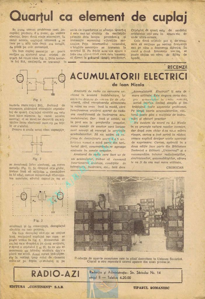 Dar numărul abonaților este în funcție de numărul aparatelor. Azi nu avem posibilitatea de a produce receptoare radiofonice în țară. Specialiștii noștri studiază și tratează cu casele mondiale problema dotării noastre cu multe sute de mii de receptoare în termen de câțiva ani. Ele vor fi, fie importate, fie fabricate în țară cu materia primă importată, fie prin ambele metode.